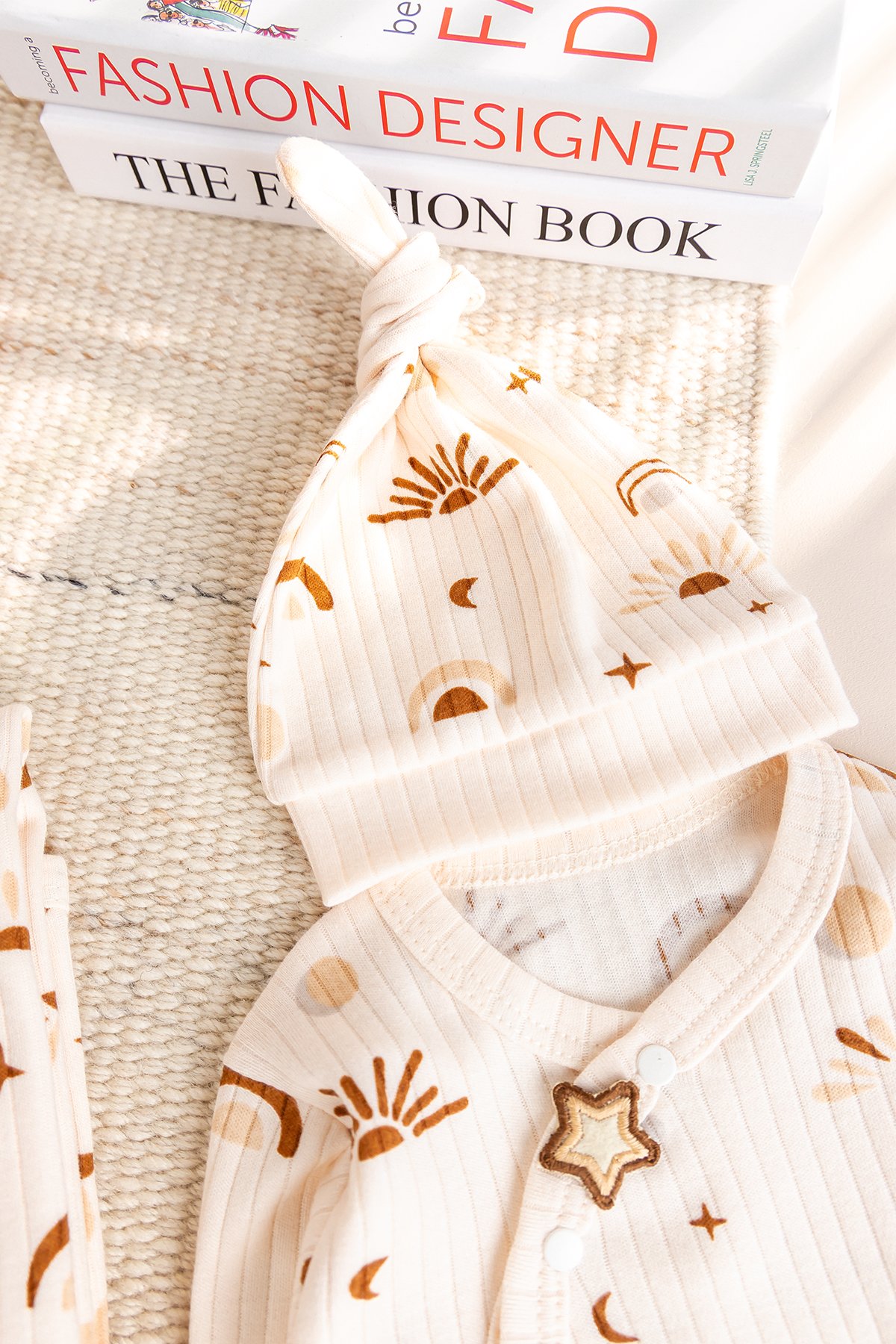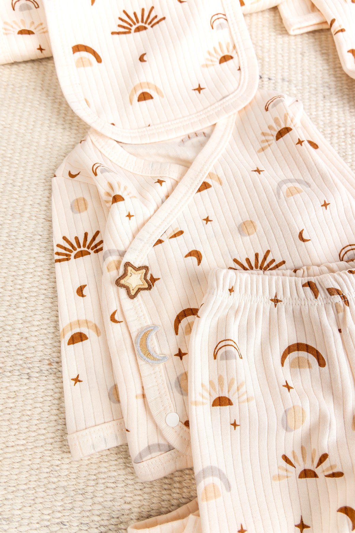 Hem kız hem de erkek bebekler için kusursuz uyum sağlayan soft renk tonları ve minimal güneş detaylarıyla modern bir görünüme sahiptir.