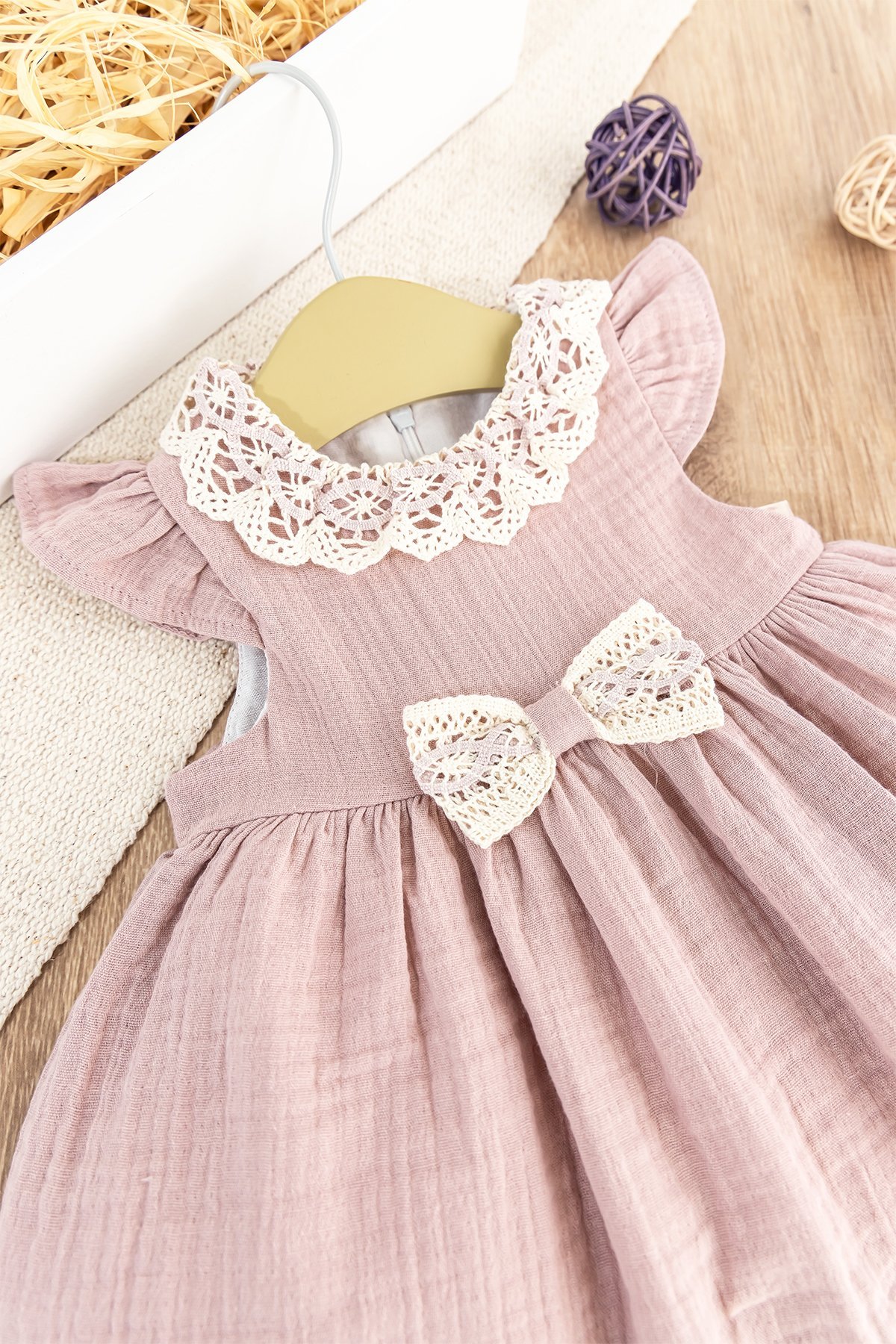 - Bebek elbisenin yakası güpür dantel detay süslemelidir.
