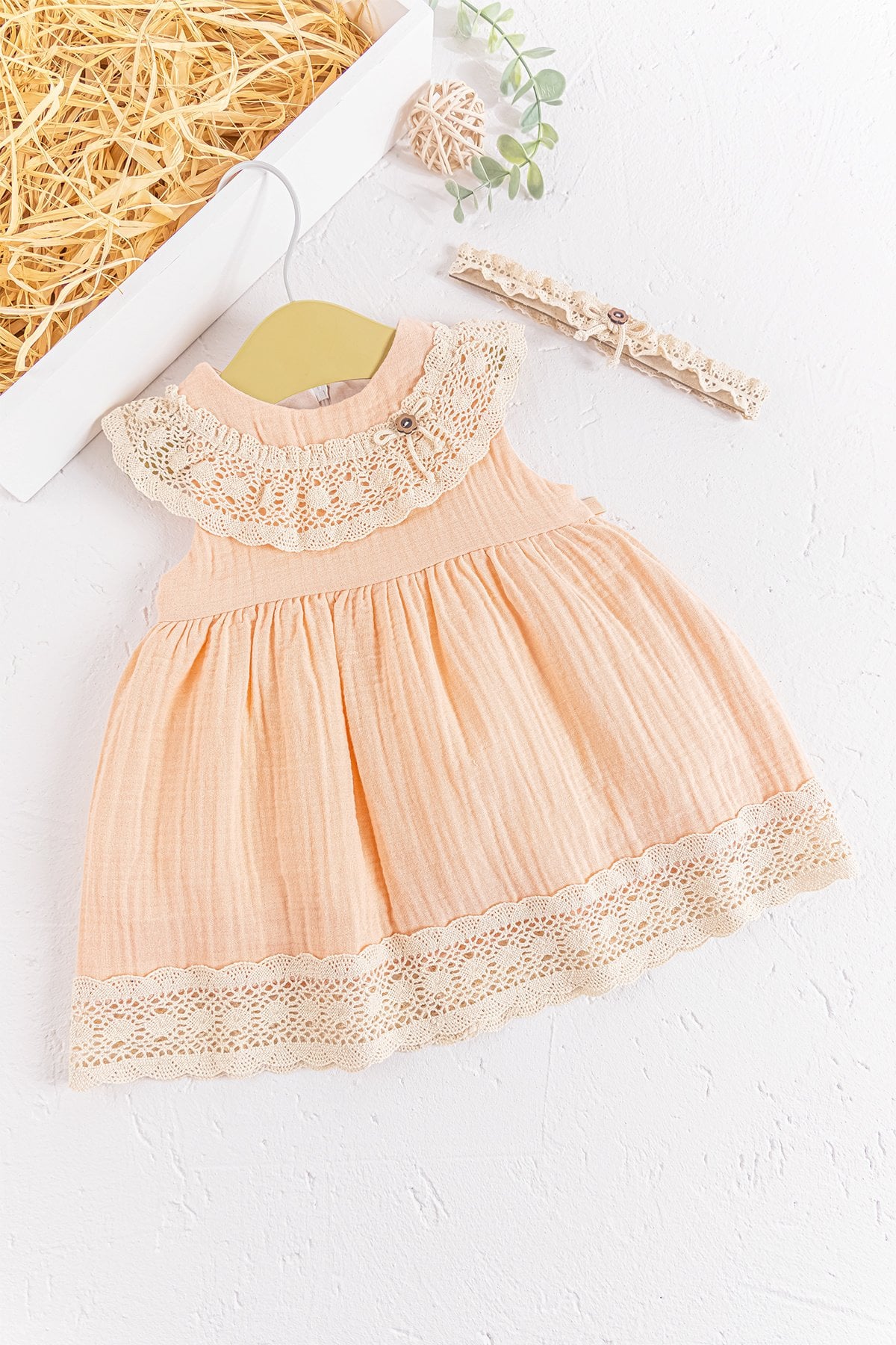 Güpür Yakalı Bandanalı Yazlık Müslin Bebek Elbise