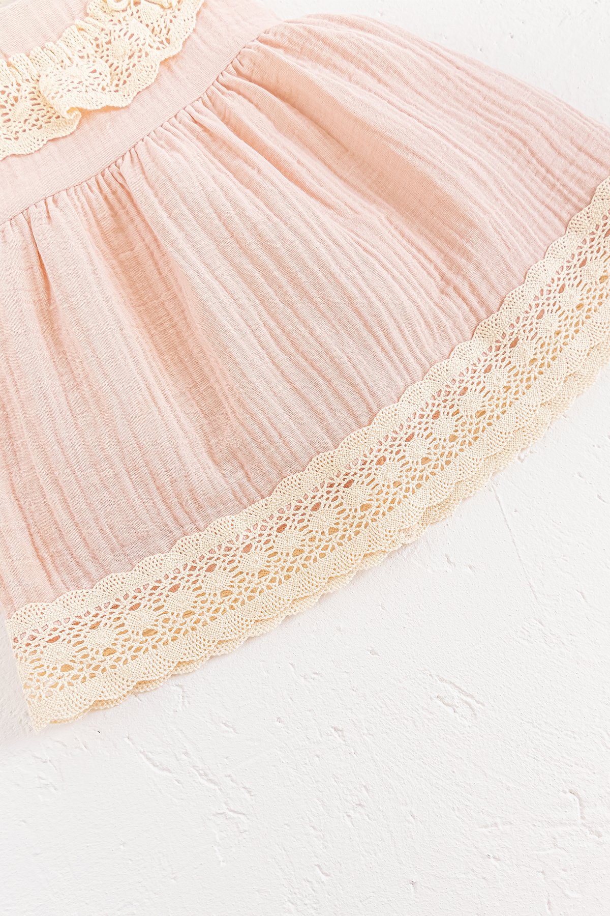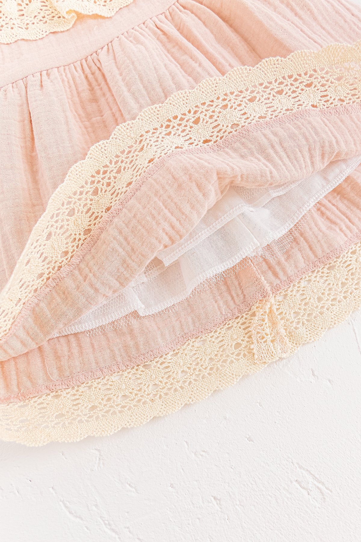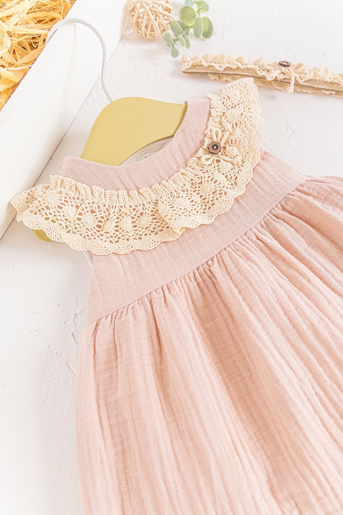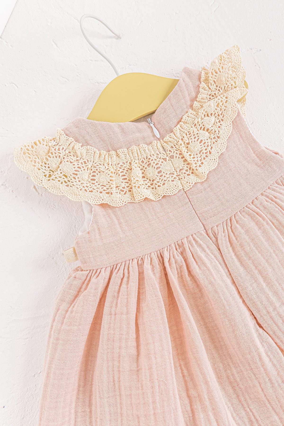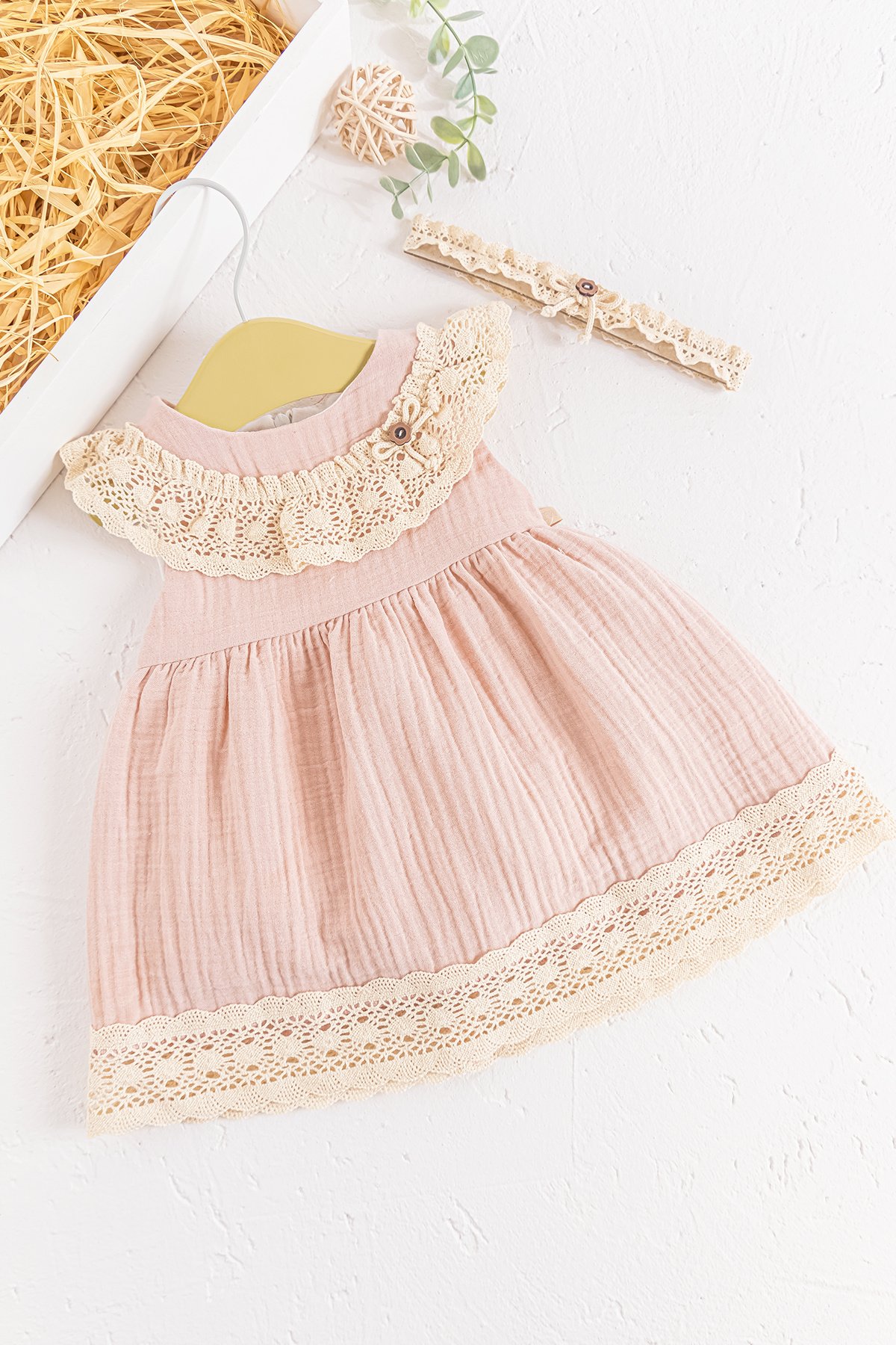 Güpür Yakalı Bandanalı Yazlık Müslin Bebek Elbise PUDRA - 18-24 AY