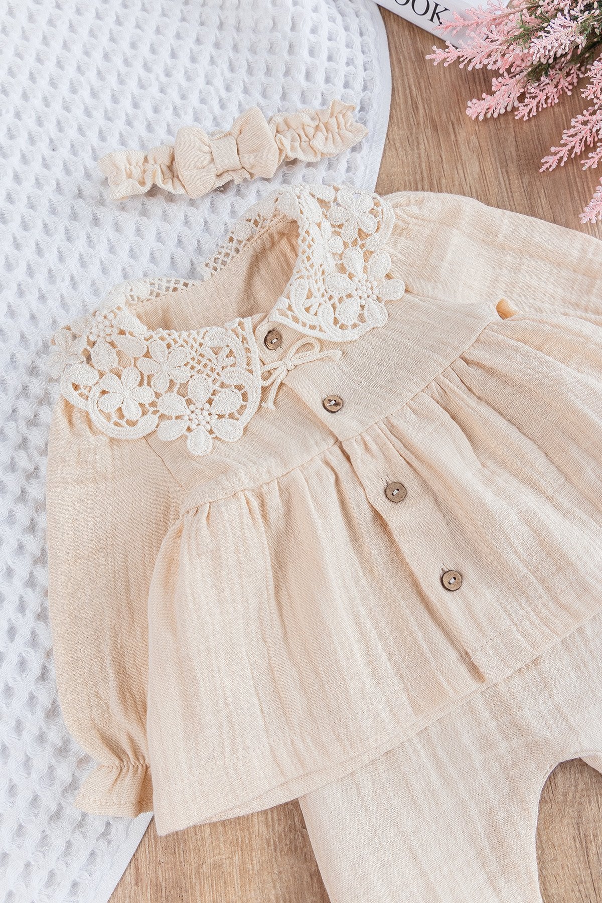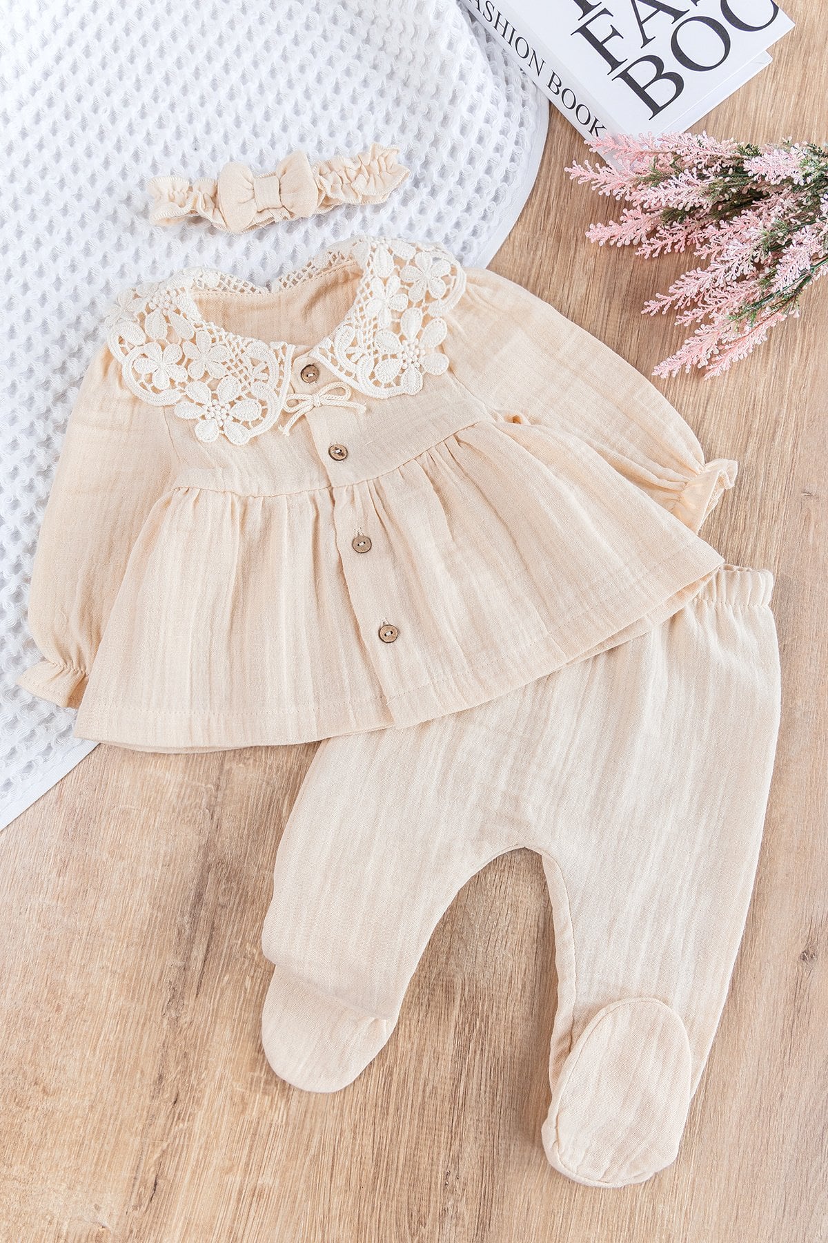 Babymod Guipure Collared Front Buttoned 3-Piece Muslin Baby Girl Hospital Release Baby Set