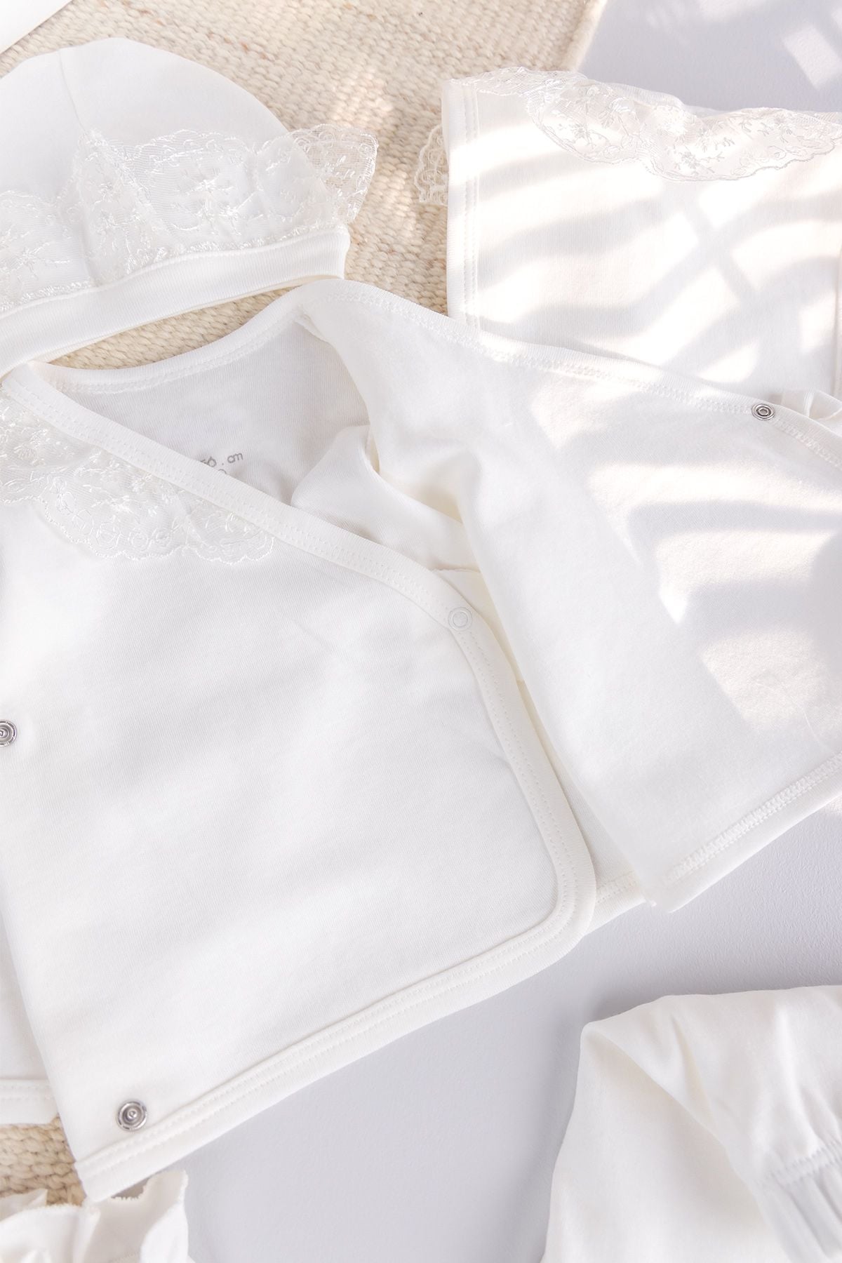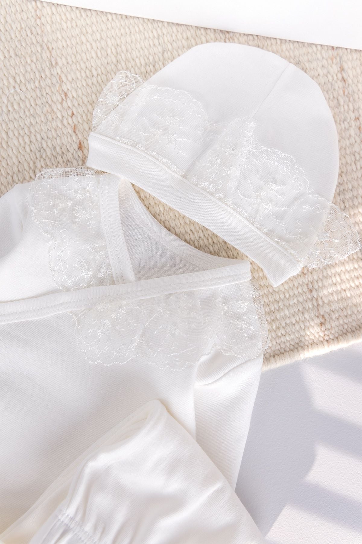 - The baby hat keeps your baby's head warm and completes the elegance of the set with its compatible guipure decoration.