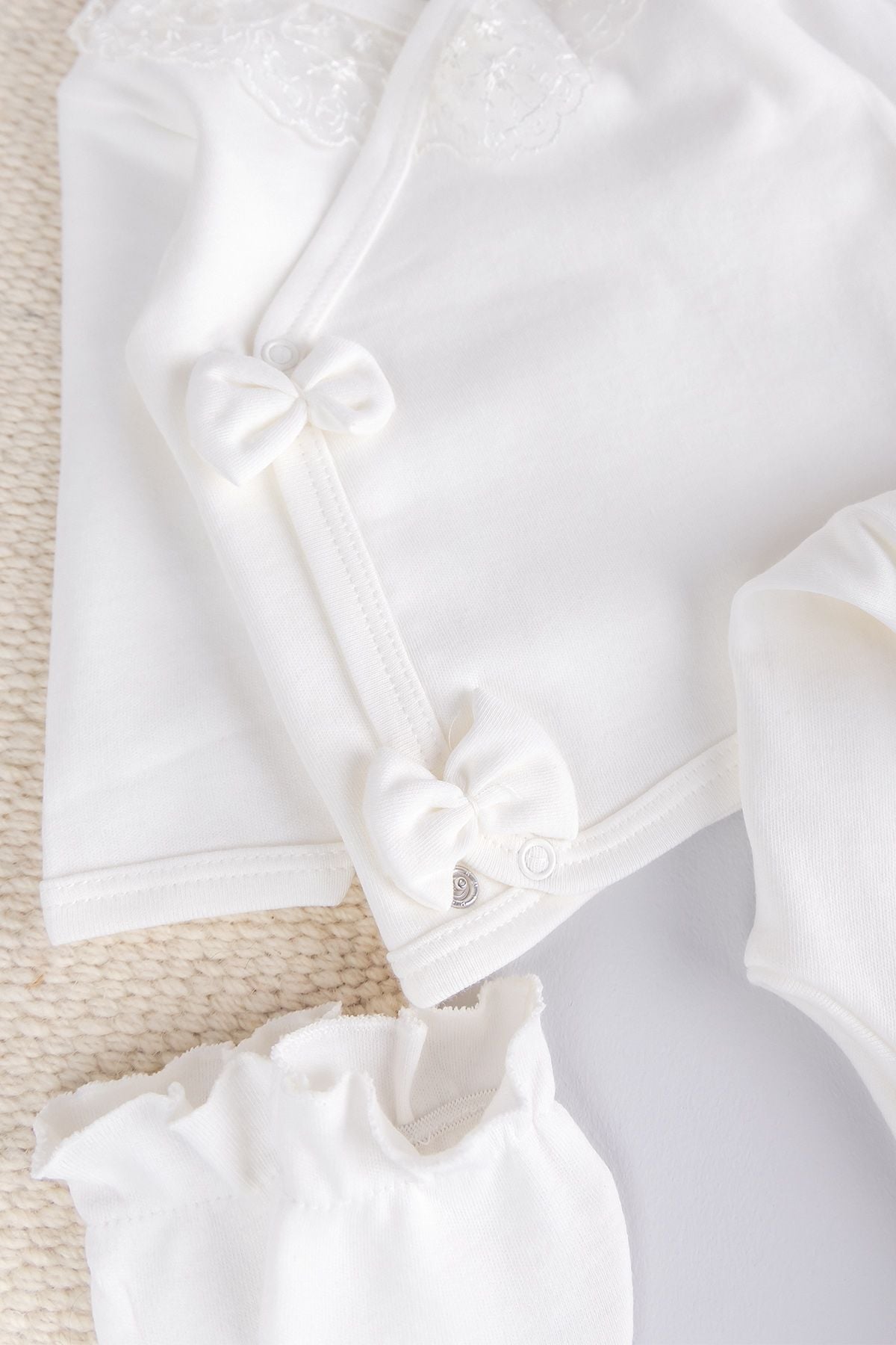 - Bebek bodynin önü güpür süslemeli ve fiyonk detaylı olması bebeğinizin şıklıgına şıklık katar