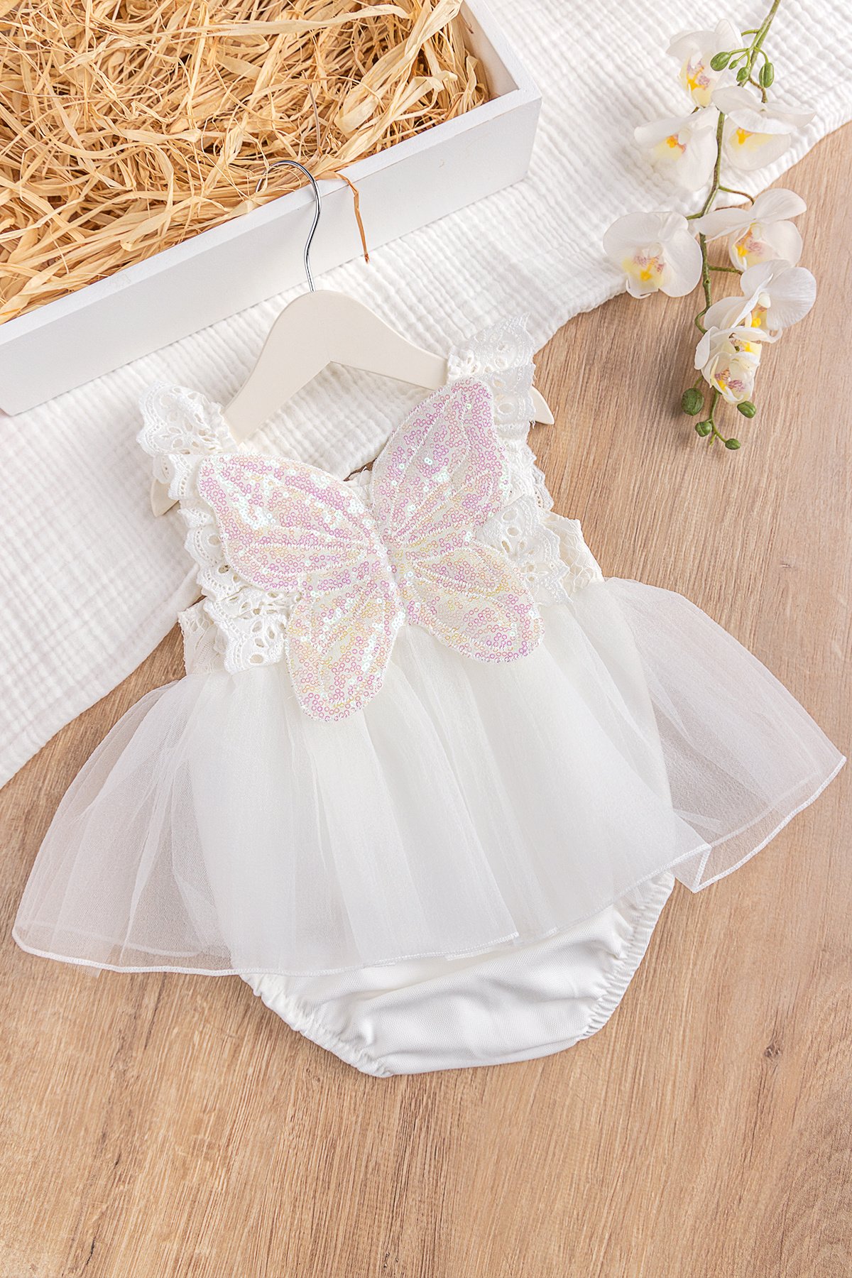 Güpürlü Askılı %100 Pamuk Kız Bebek Elbise Tulum KREM - 3 Ay