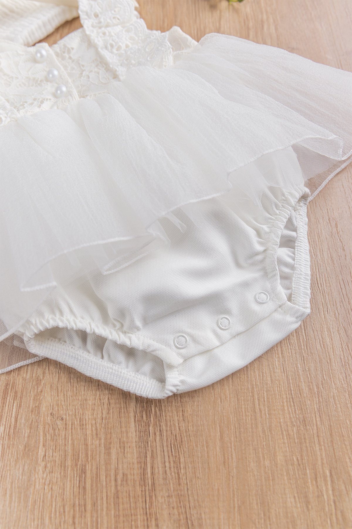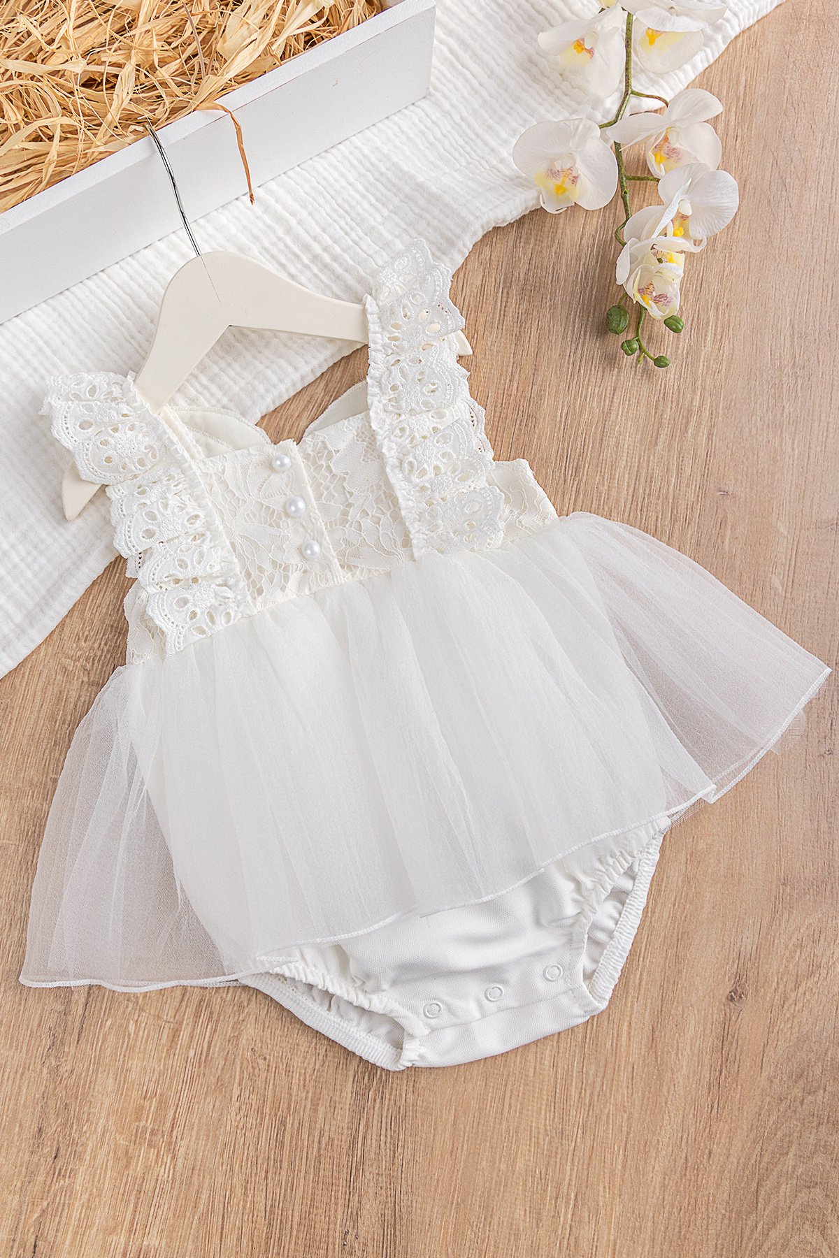 Bebek elbisenin üst kısmı güpürlüdür.