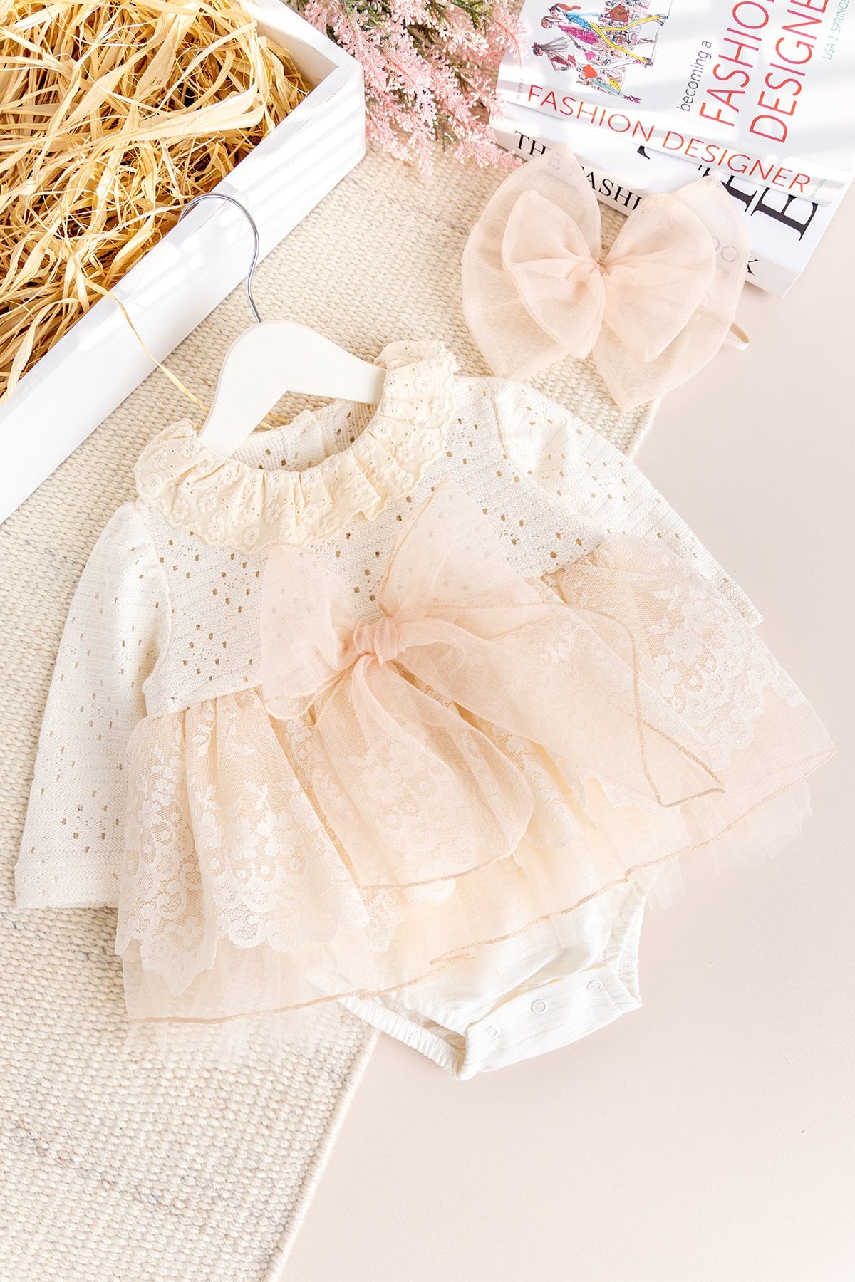 Güpürlü Bandanalı Triko Şık Kız Bebek Elbise Tulum