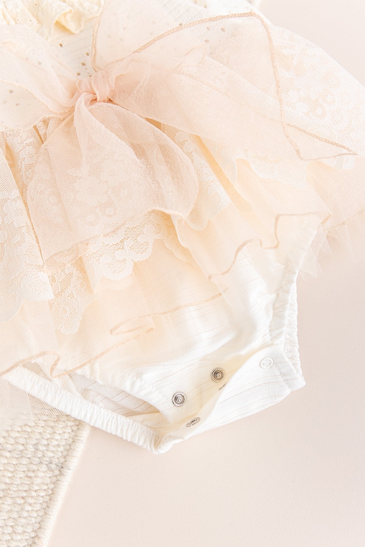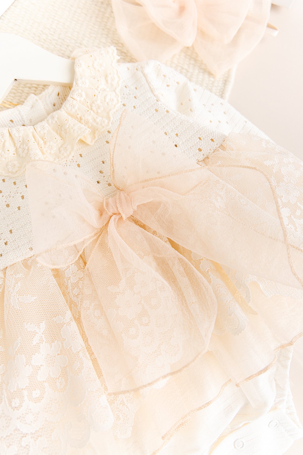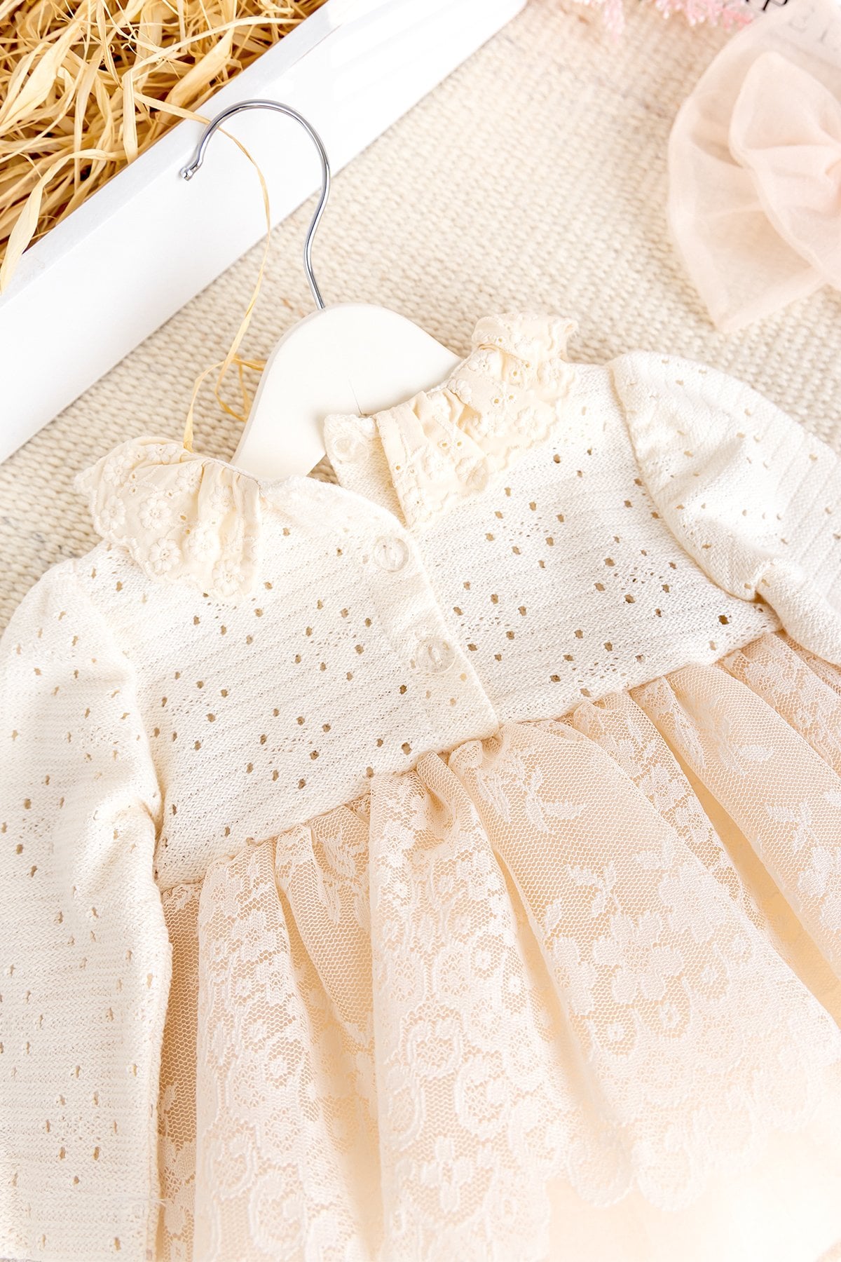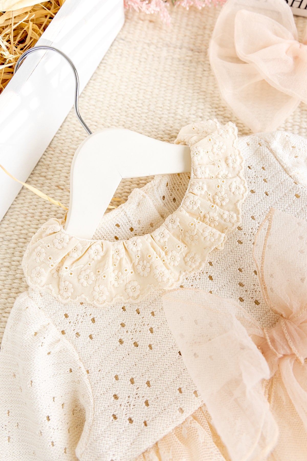 - Bebek elbisenin bel kısmı güpürlü fır fırlı süslemelidir