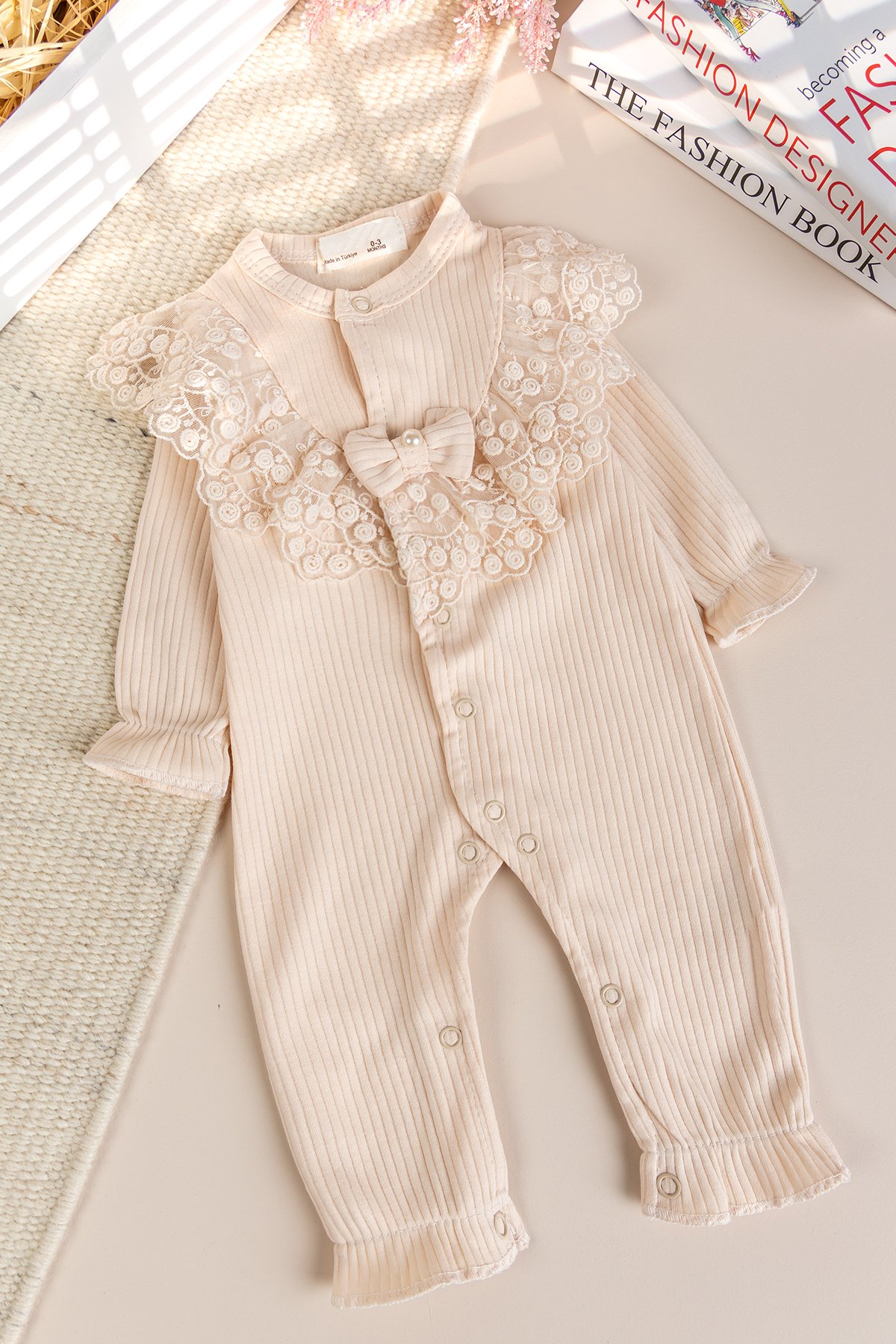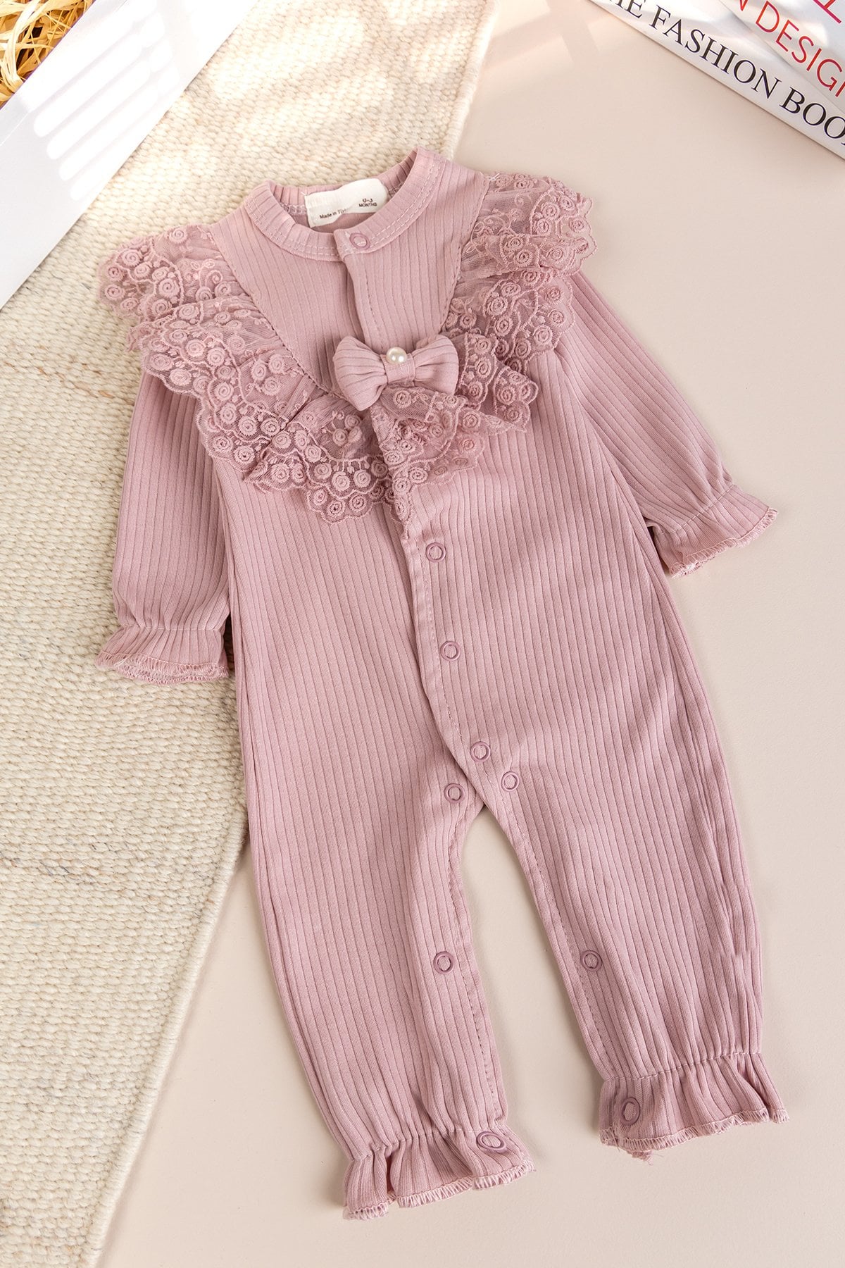 Güpürlü Fiyonklu 100% Pamuk Kız Bebek Tulum