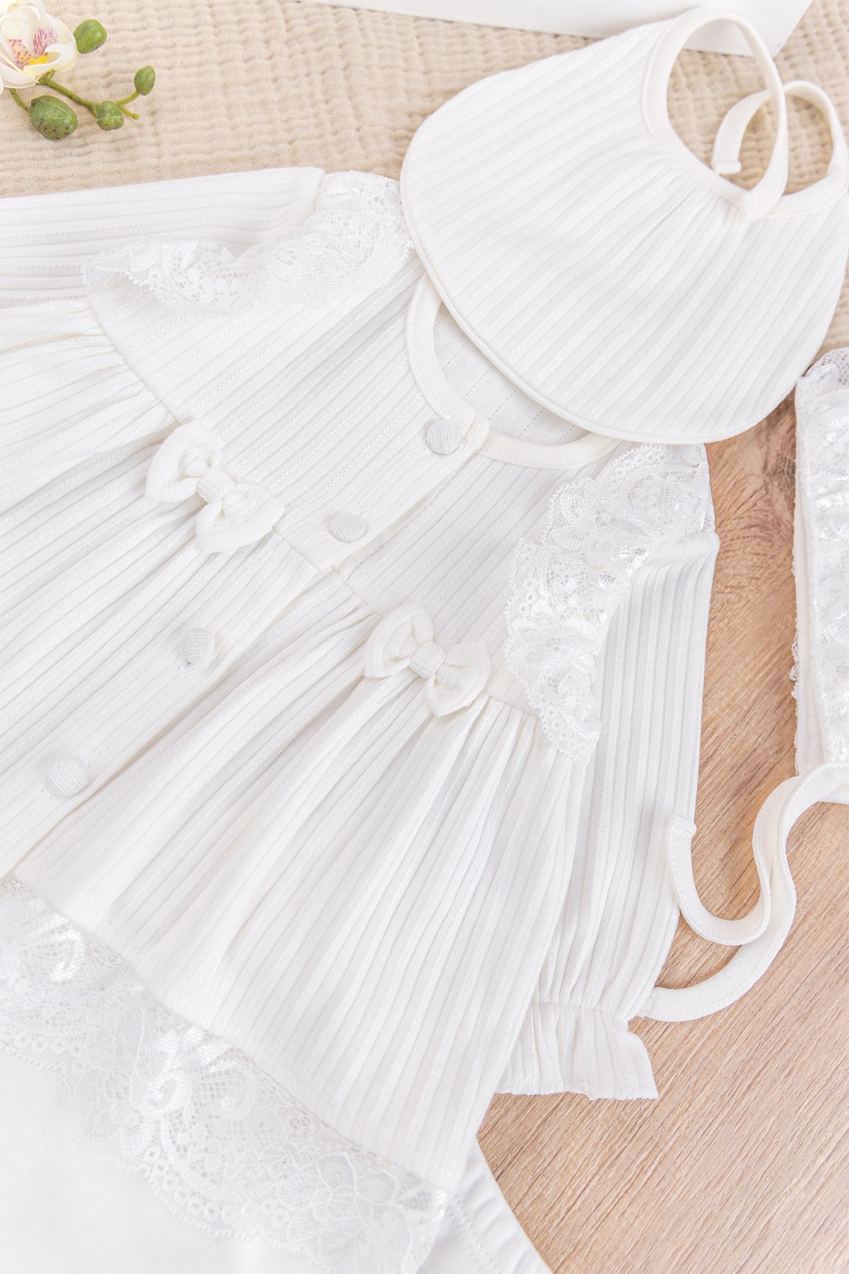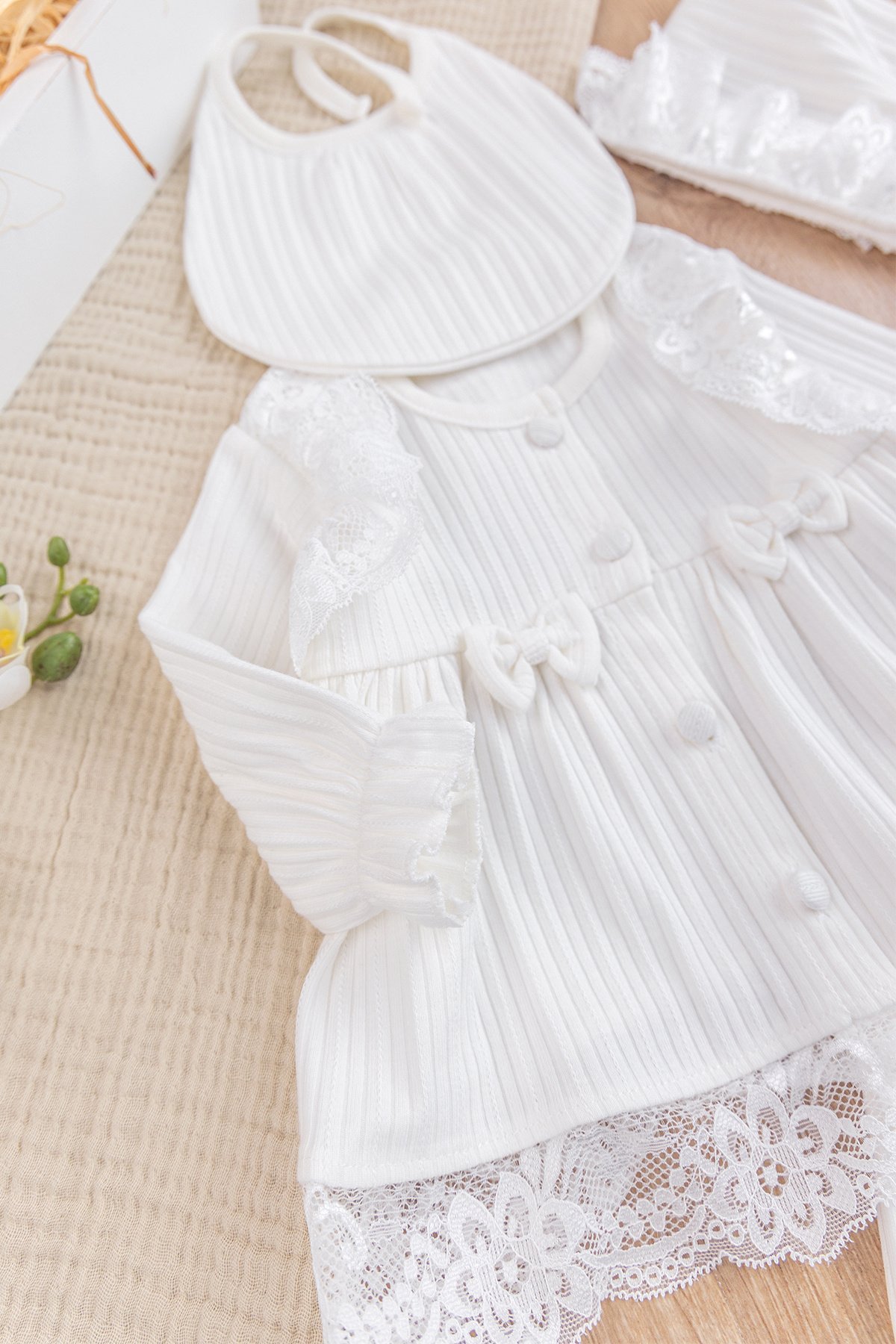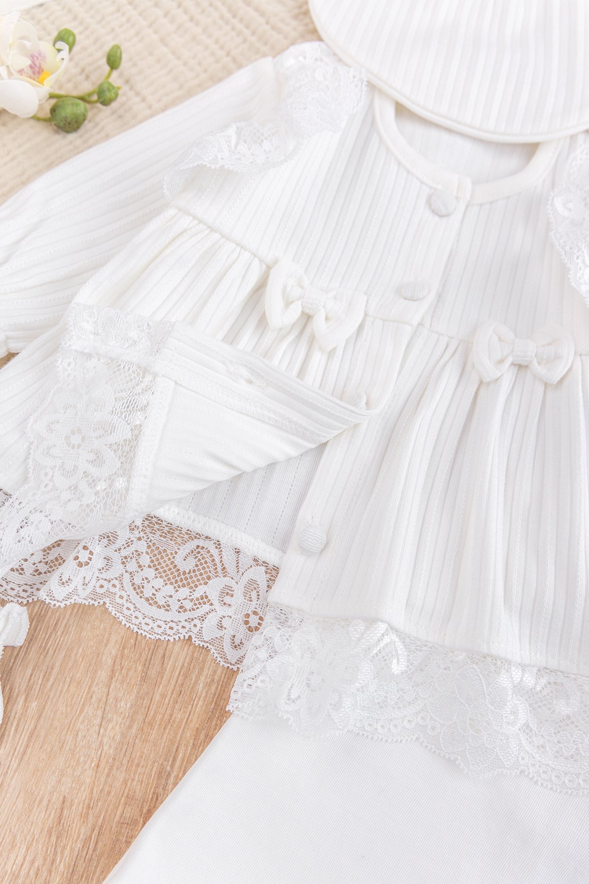 Güpürlü Fiyonklu %100 Pamuklu Yumuşak Dokulu Kız Bebek Hastane çıkışı Bebek Takım Krem