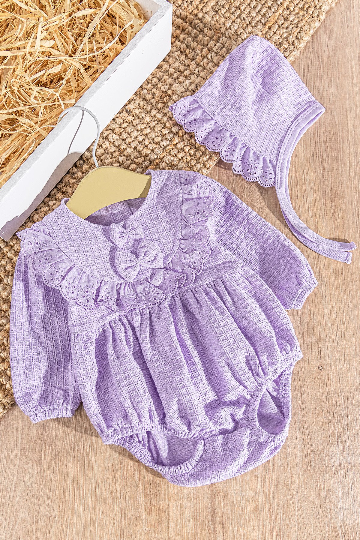 Güpürlü Şapkalı Kendinden Desenli Kız Bebek Tulum