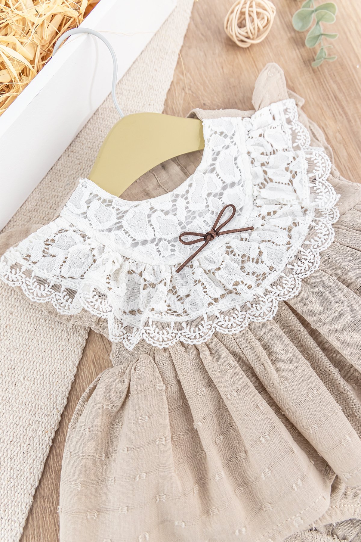 - Bebek elbisenin yakası güpürlüdür.