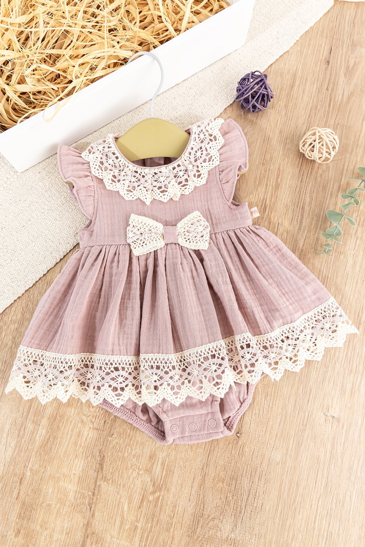 Güpürlü Fiyonklu Yazlık Müslin Kız Bebek Elbise Bebek Tulum