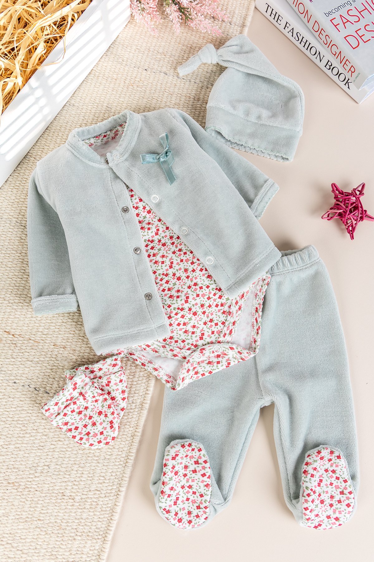 Hırkalı 5'li Pamuklu Kadife Kız Bebek Takım Set Hastane Çıkışı