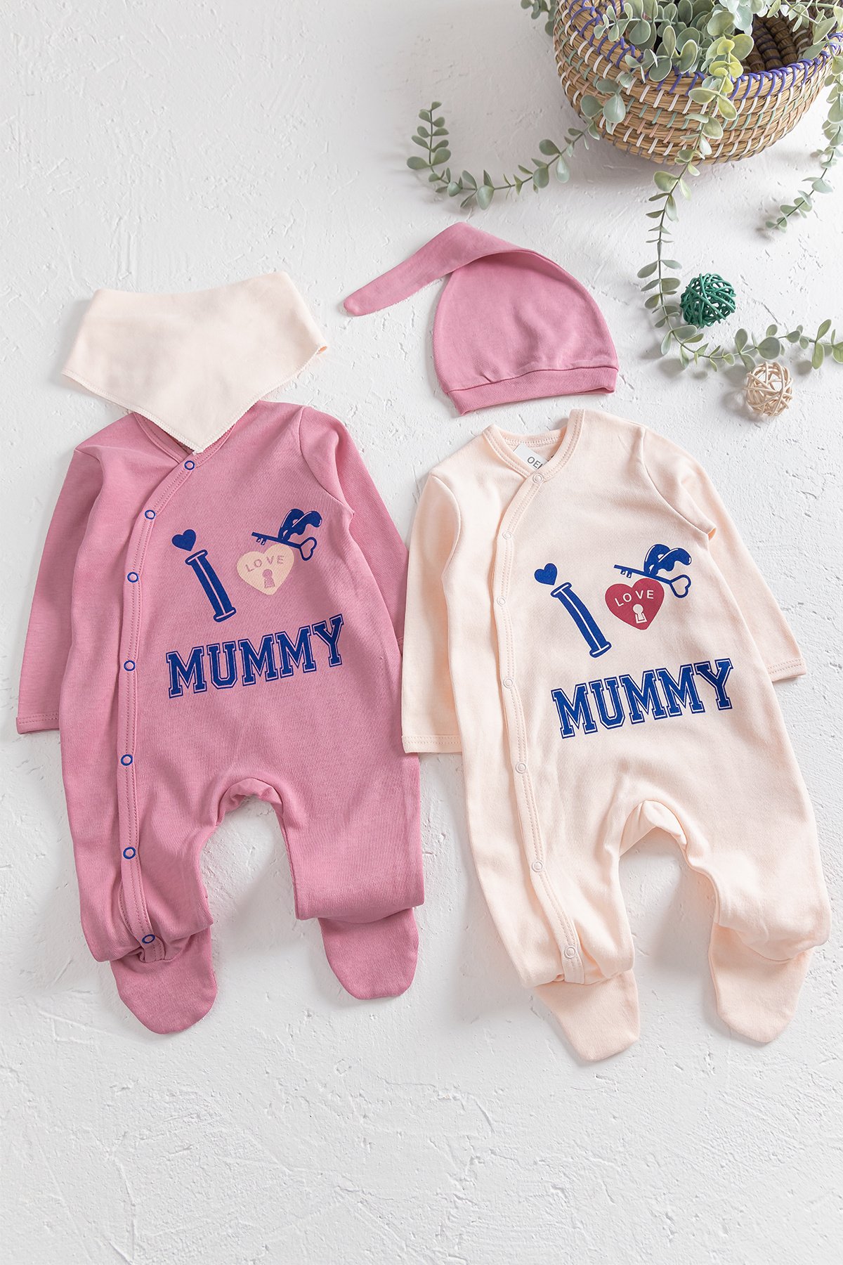 I Love Mummy Baskılı 2'li Uzun Kollu Kız/Erkek Bebek Tulum Takım