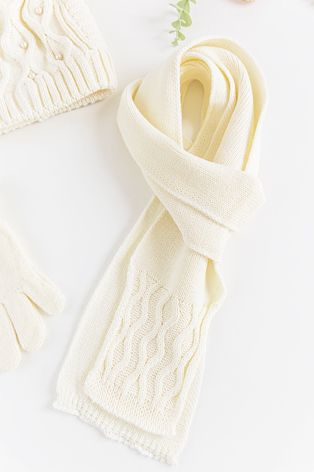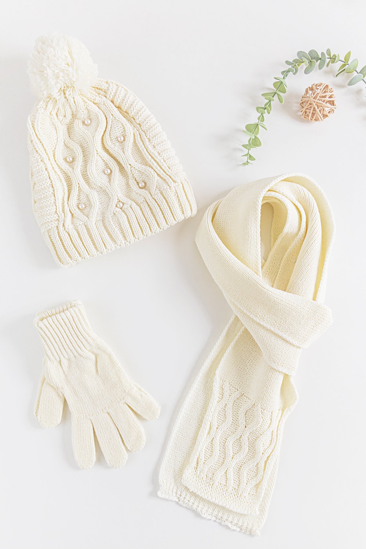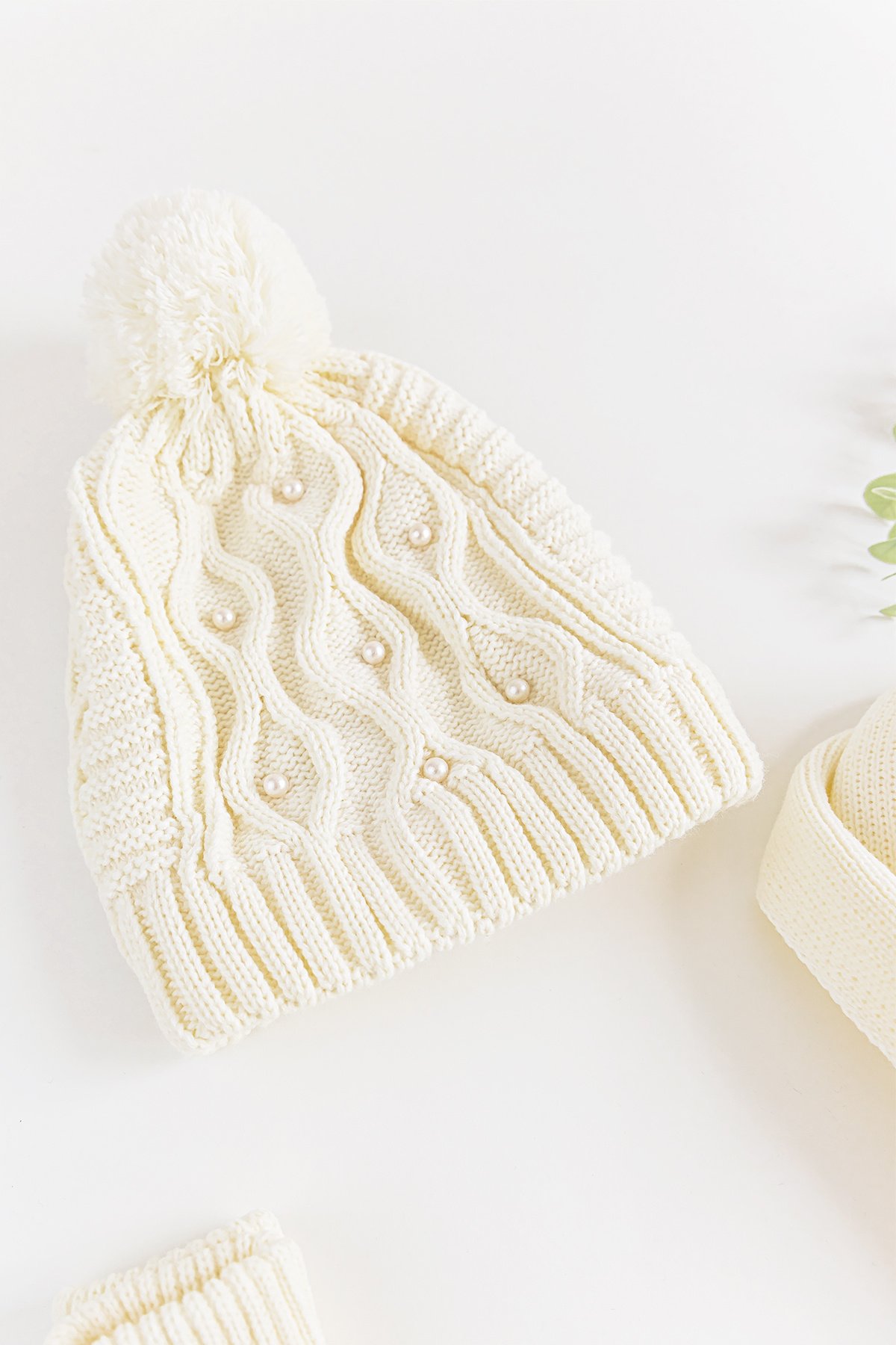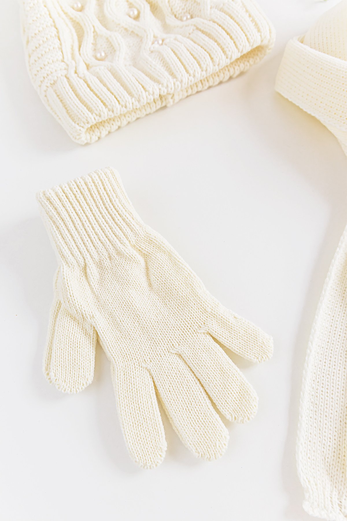 İnci Süslemeli 9-15 Yaş Kız Çocuk Atkı Bere Eldiven Takımı KREM - 9-15 Yaş