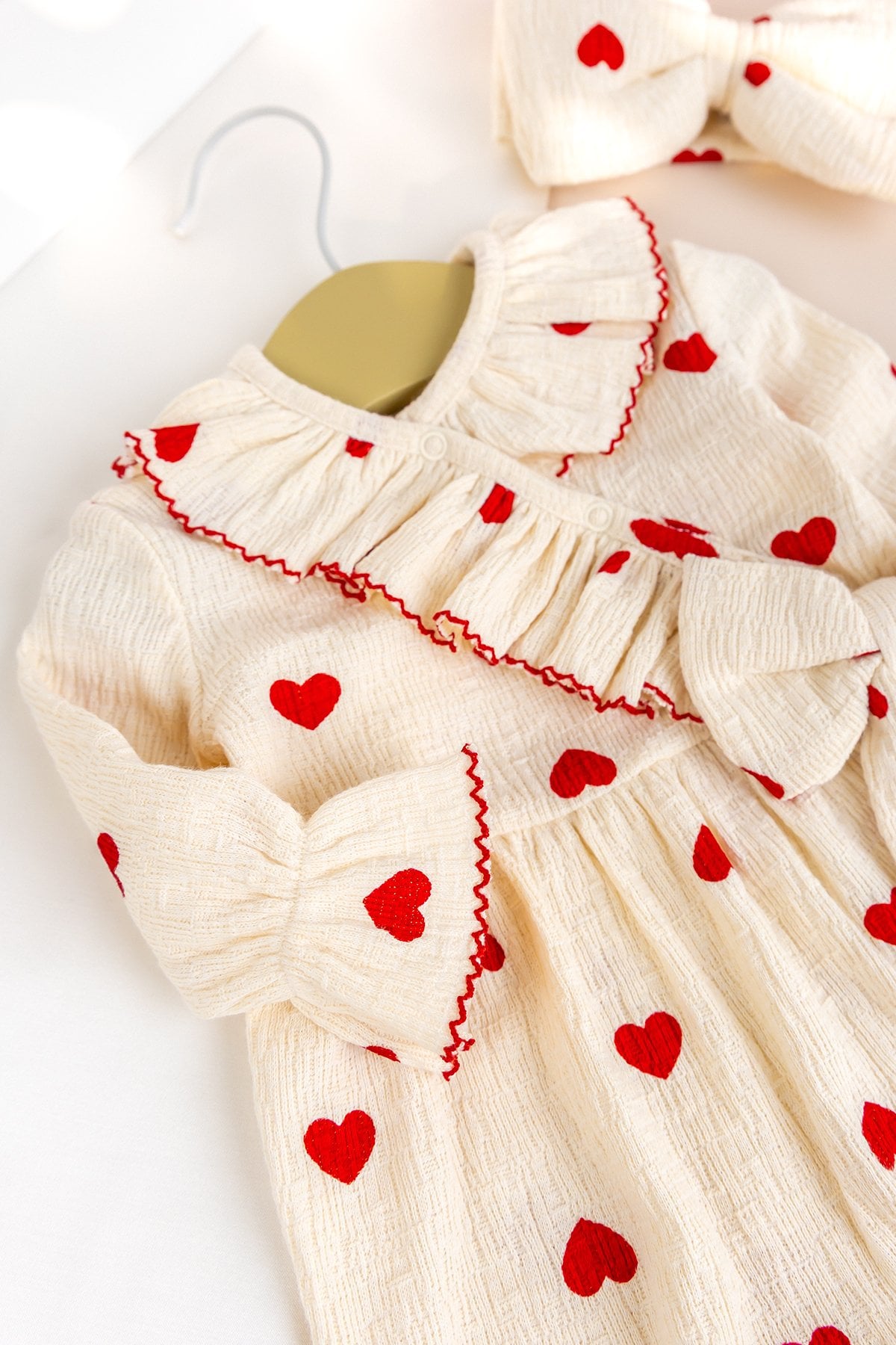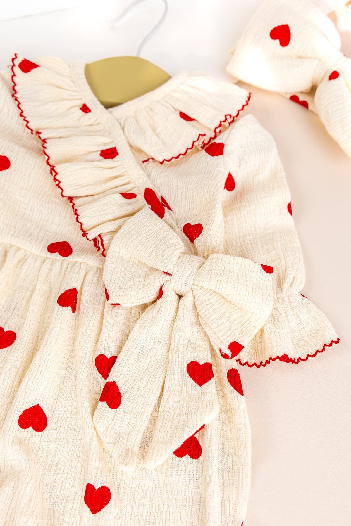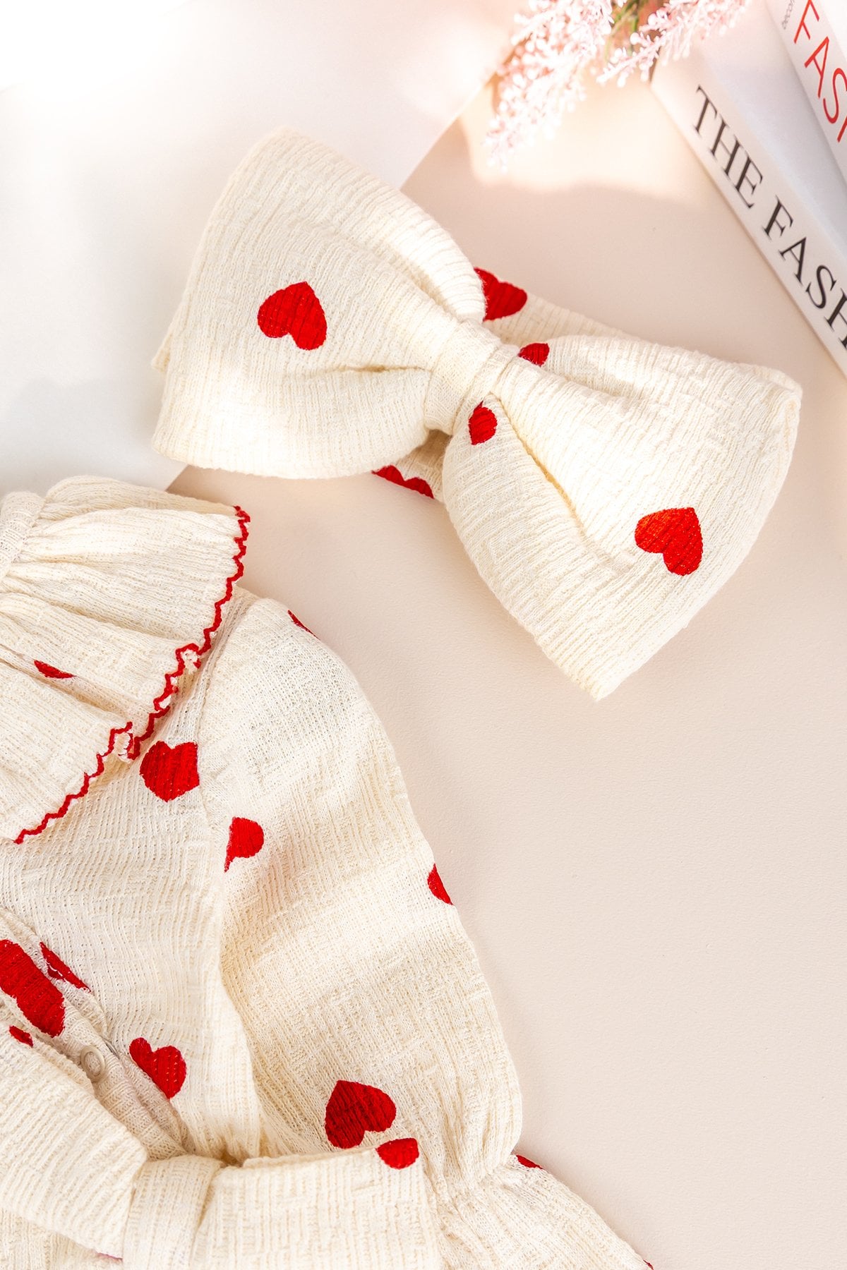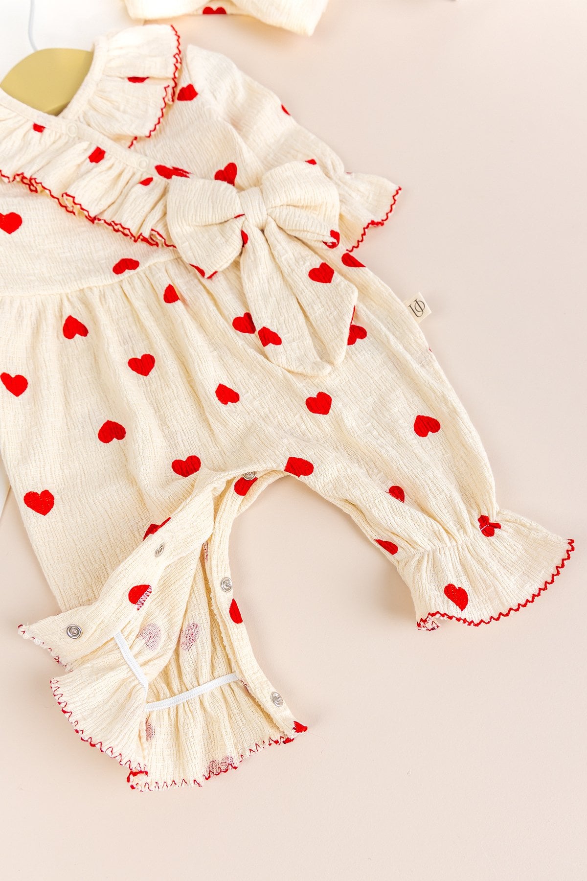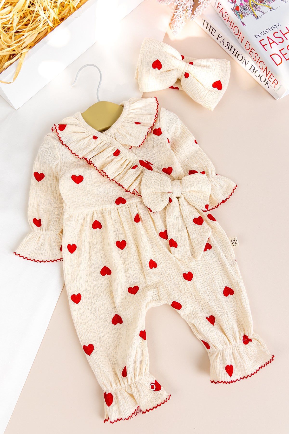 - Sevimli kalp desenleri ve zarif fiyok detayı tuluma tatlı bir şıklık katarken, uyumlu bandanası kombini tamamlar.