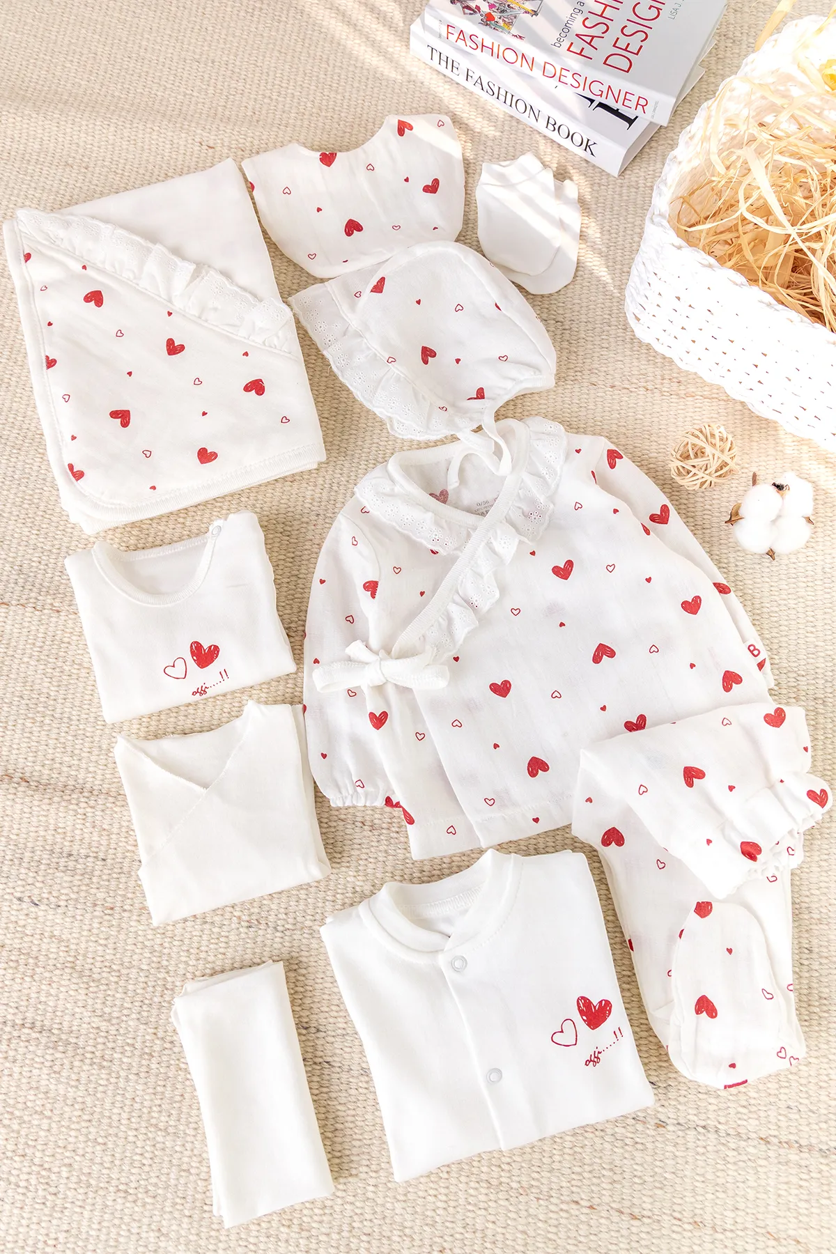 Babymod Heart Patterned Muslin 100% Cotton 10-Piece Girl Baby Hospital Discharge Baby Set