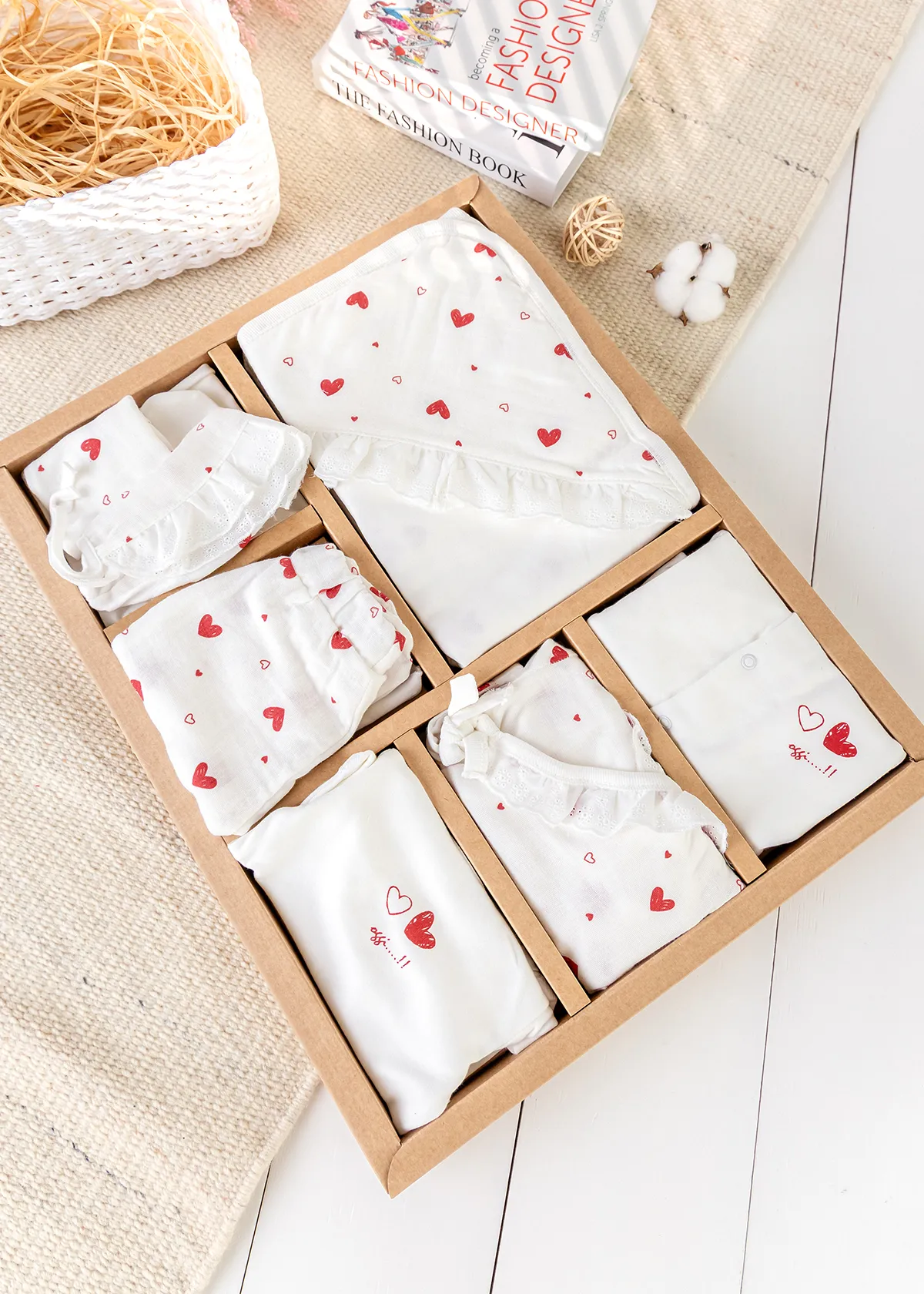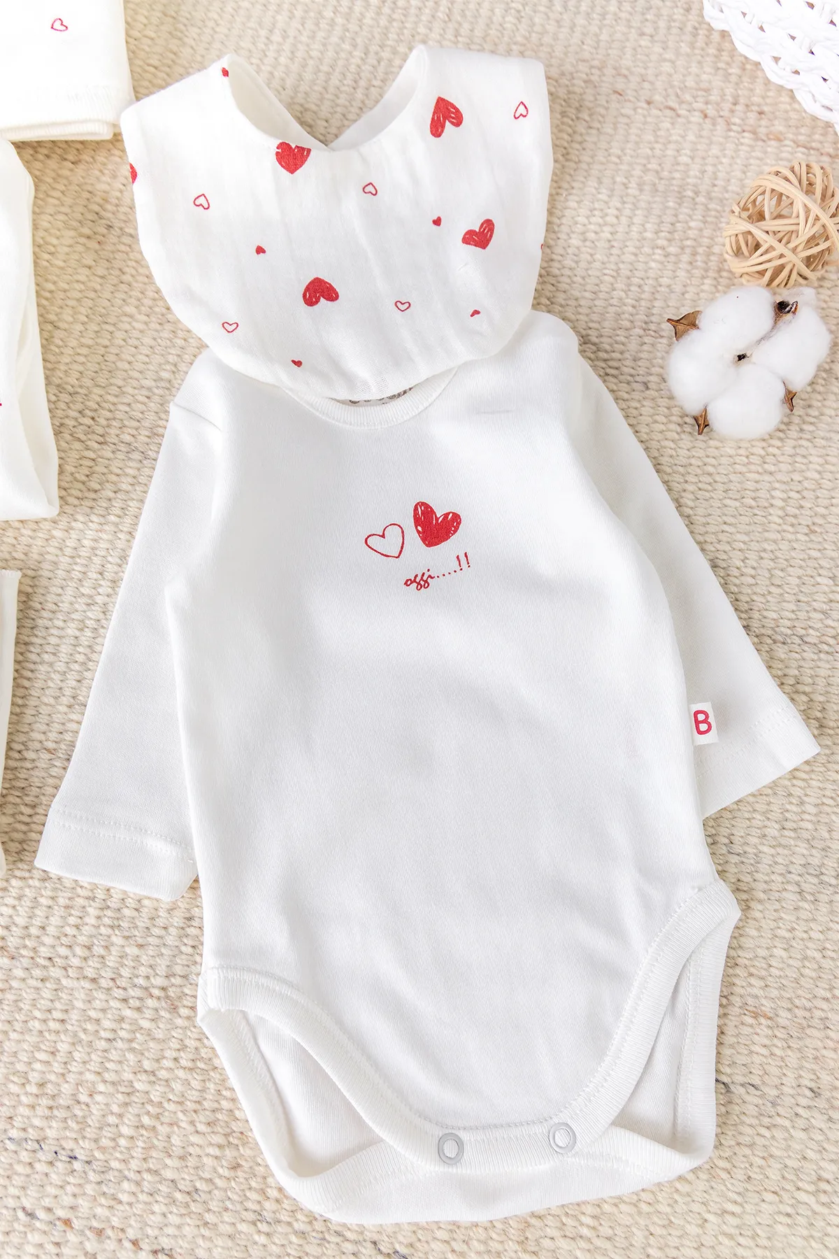 Kalp Desenli Müslin 100% Pamuk 10'lu Kız Bebek Hastane Çıkışı Bebek Takımı Set