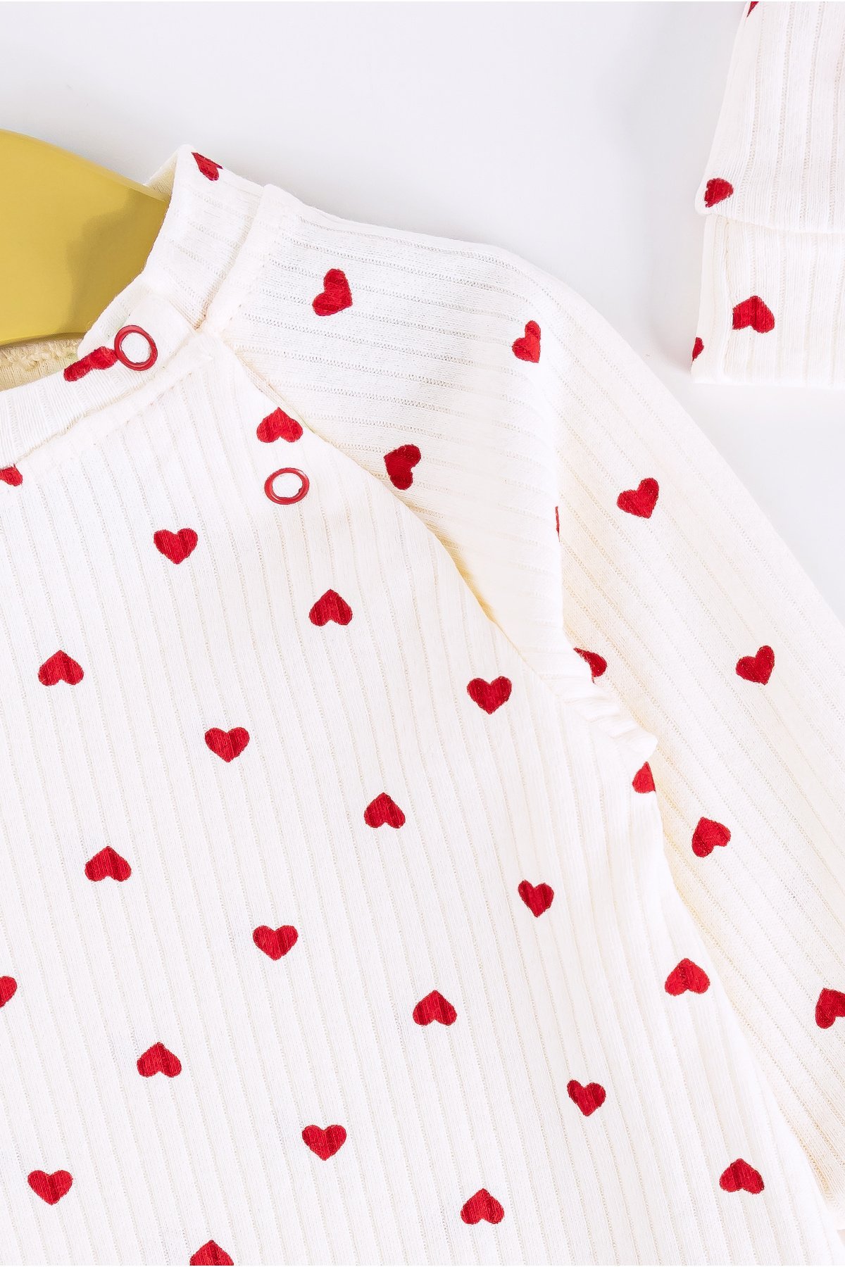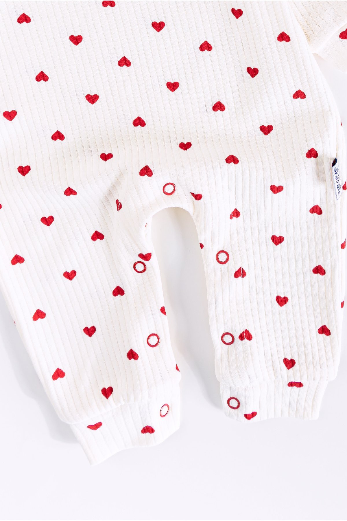 - The baby romper has a heart pattern.