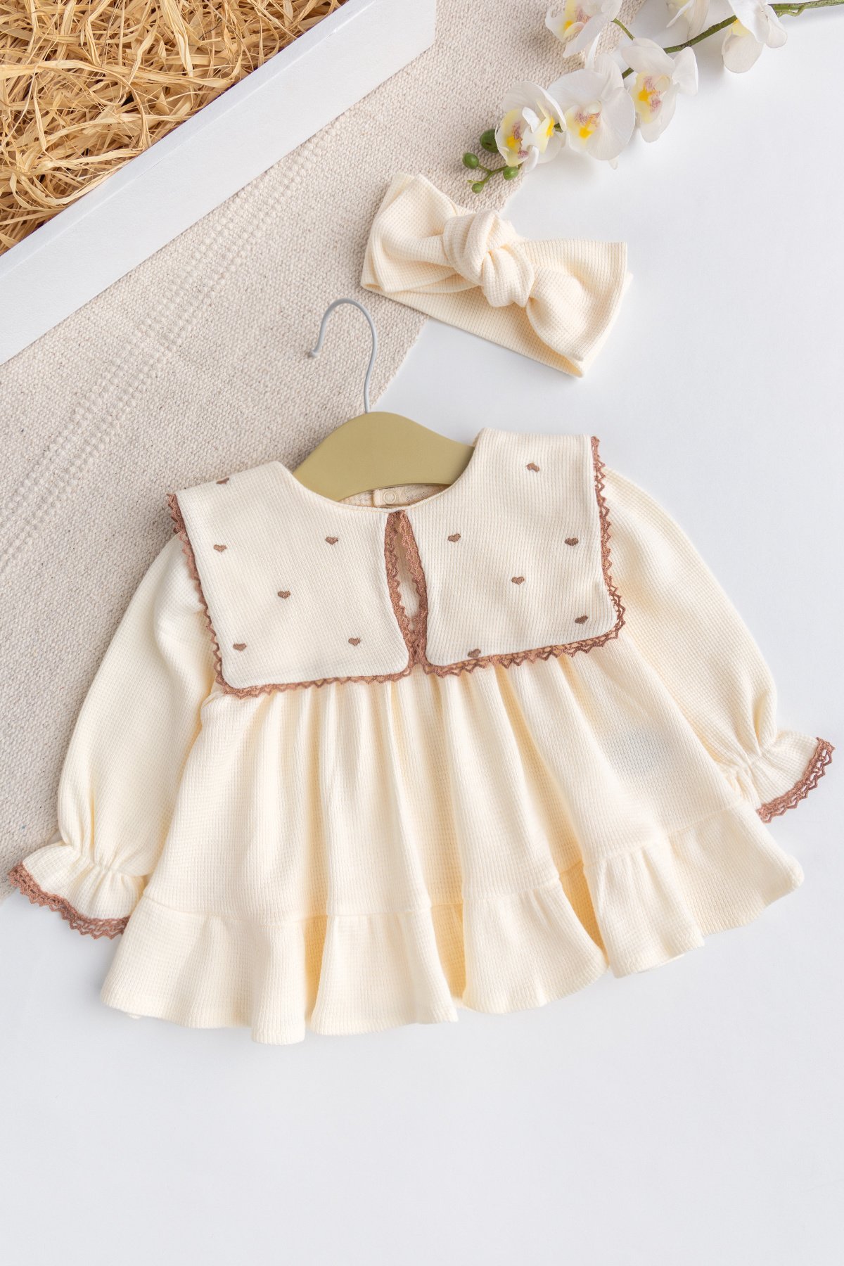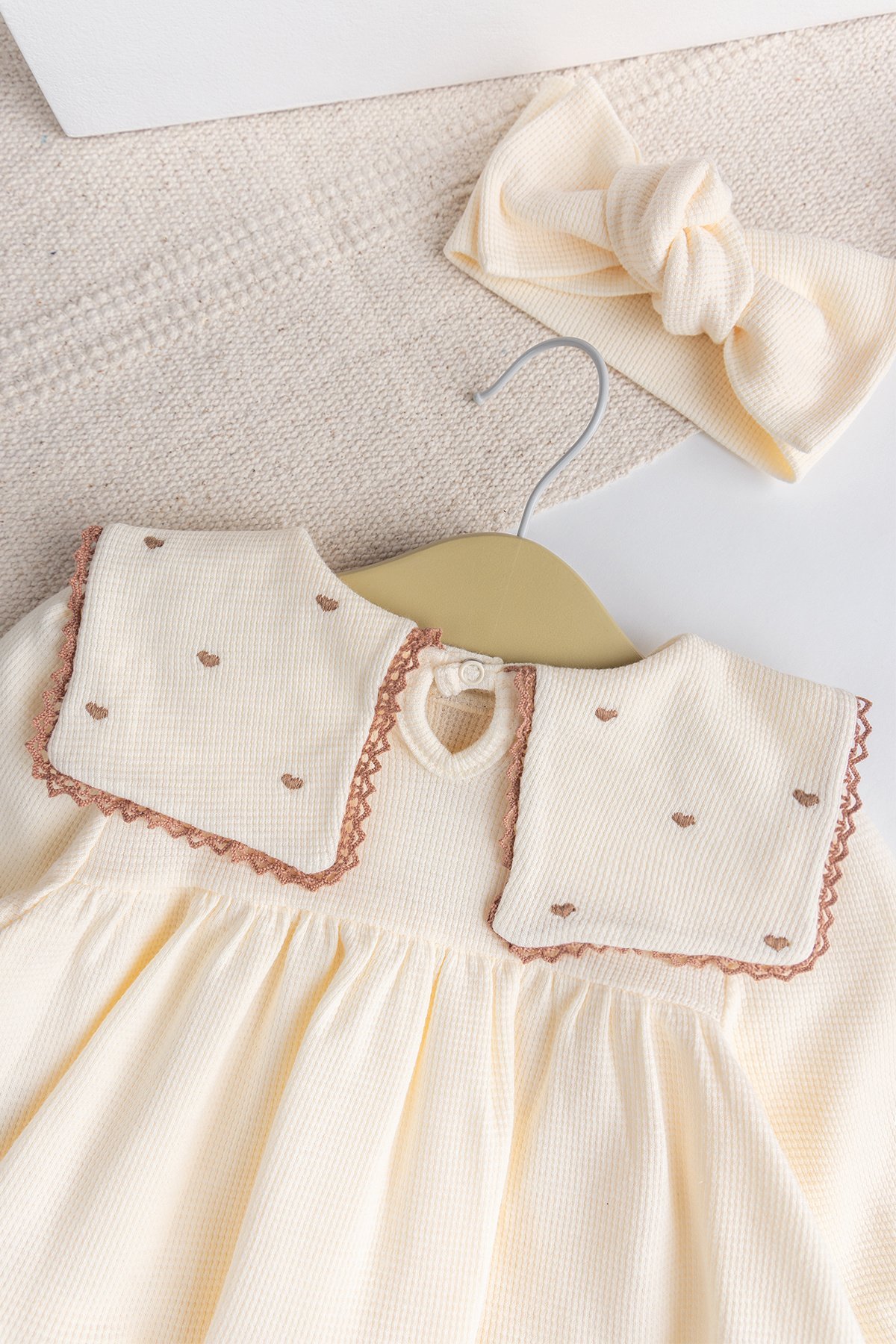 Kare Mendil Yakalı %100 Pamuk Kalp Nakışlı Bandanalı Kız Bebek Elbise Dogumğünü Özelğün Takım