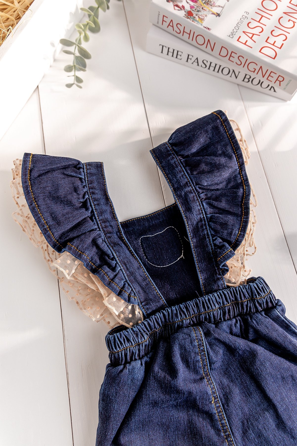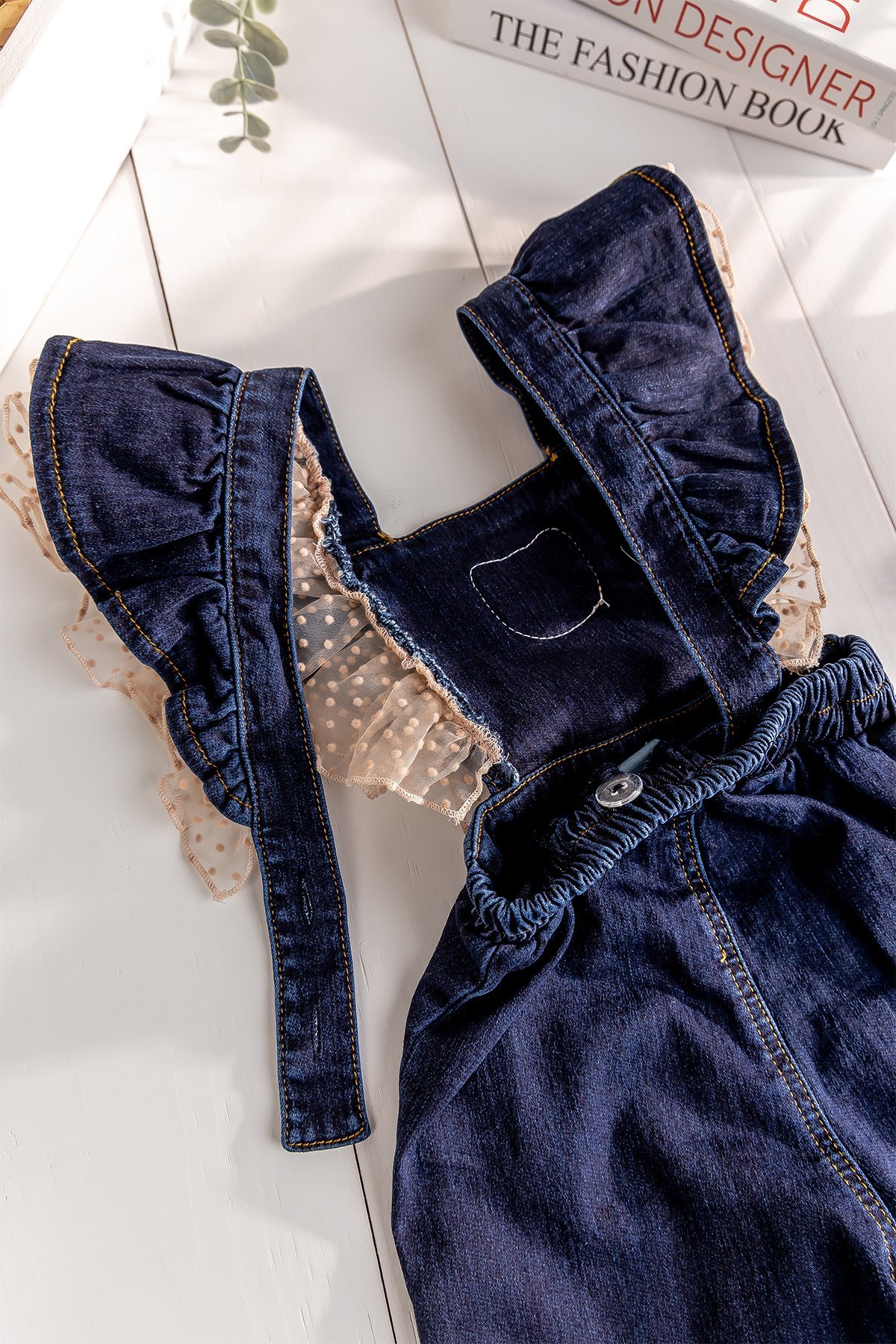 - Kız bebek çocuk salopetin omuzları tül fırfır süslemelidir