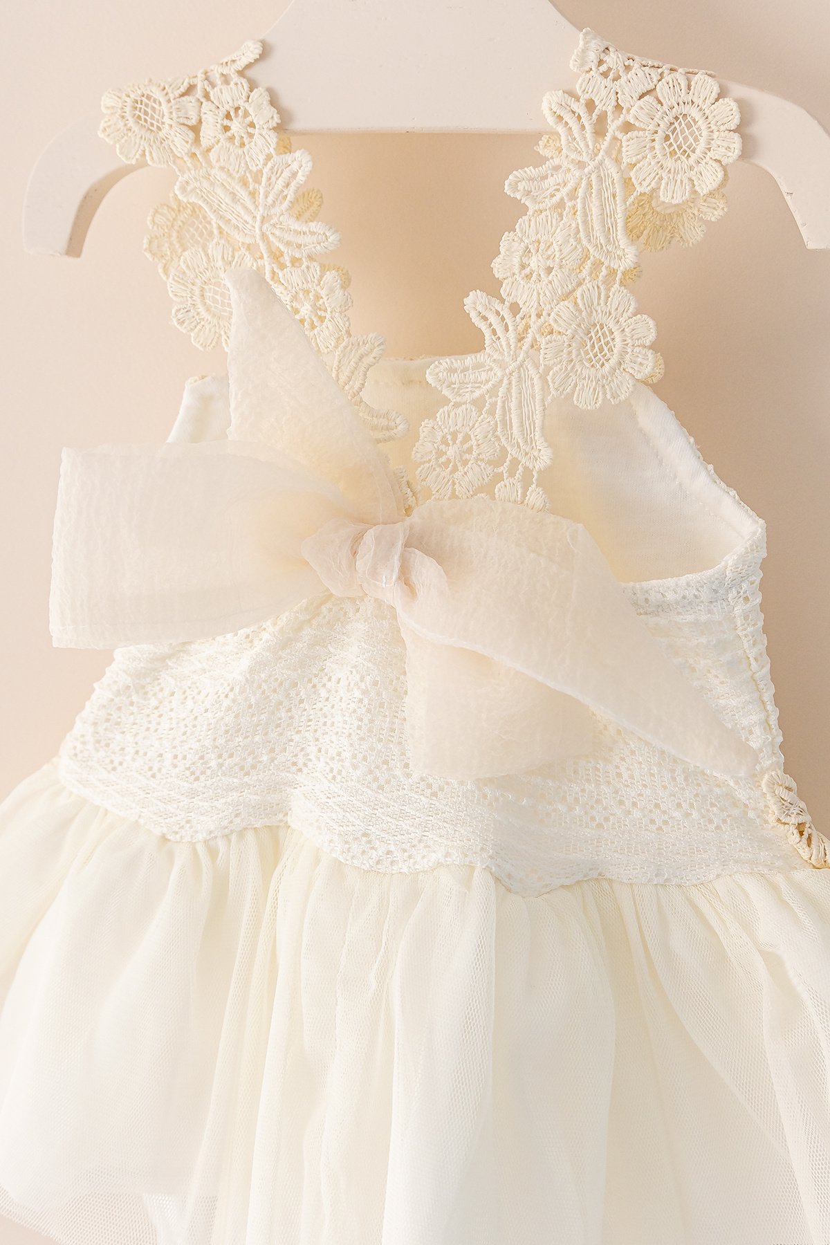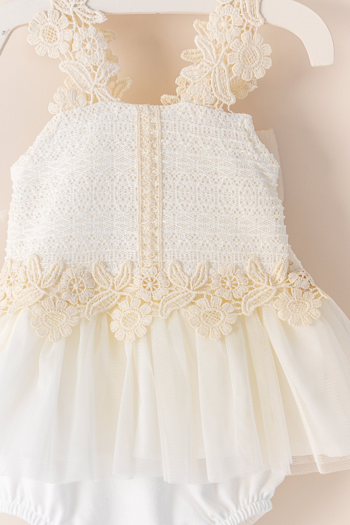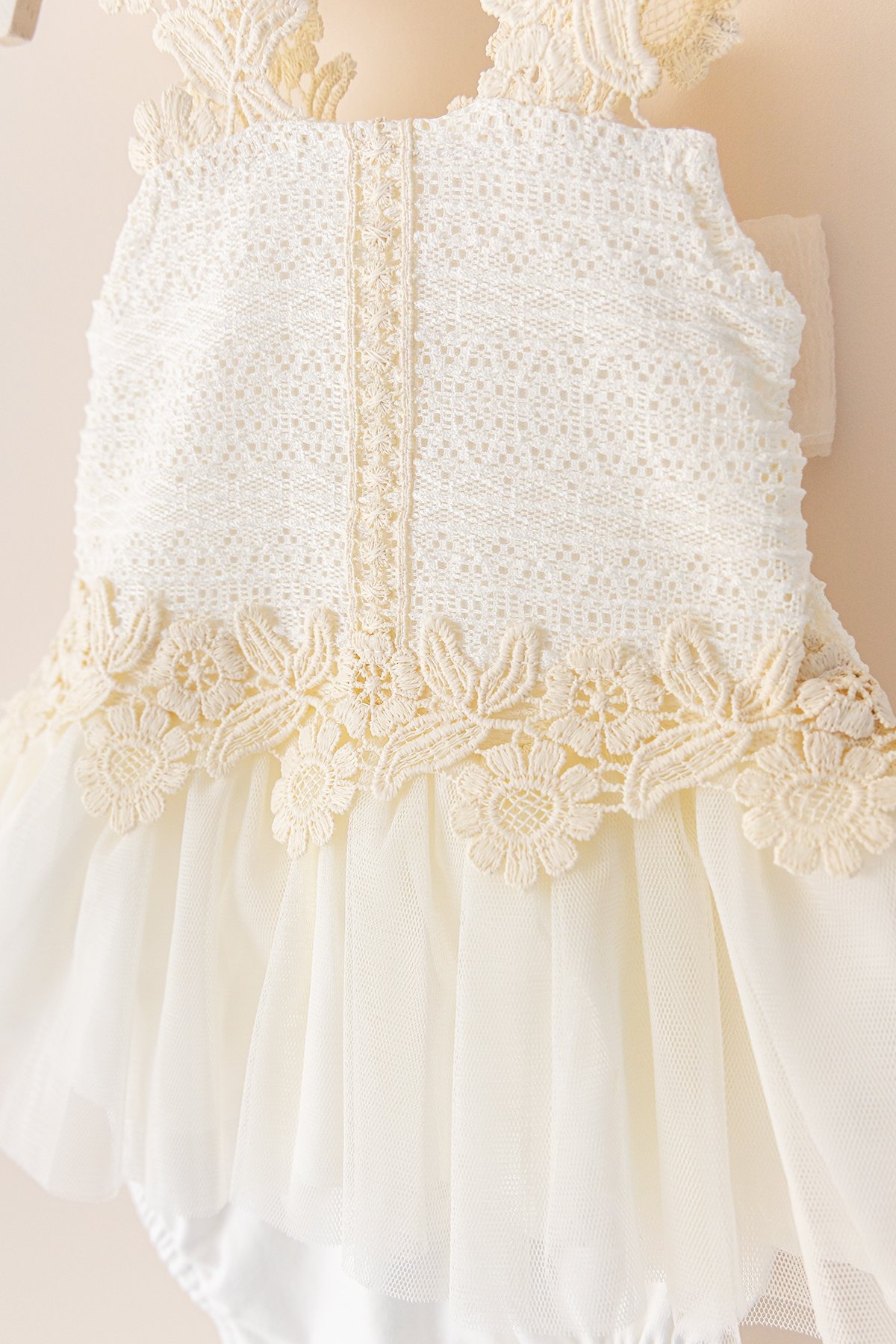 - Elbisenin bel kısmı dantel detaylıdır ve tül kumaşlı fırfır süslemesi vardır.