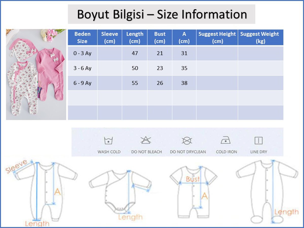 - Görselde kullanılan ürün bedeni 0-3 Ay bedendir.