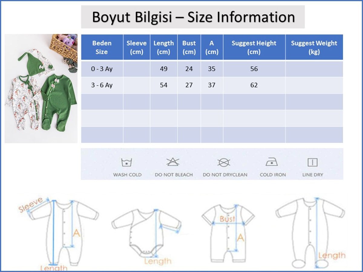 - Görselde kullanılan ürün bedeni 0-3 Ay bedendir.