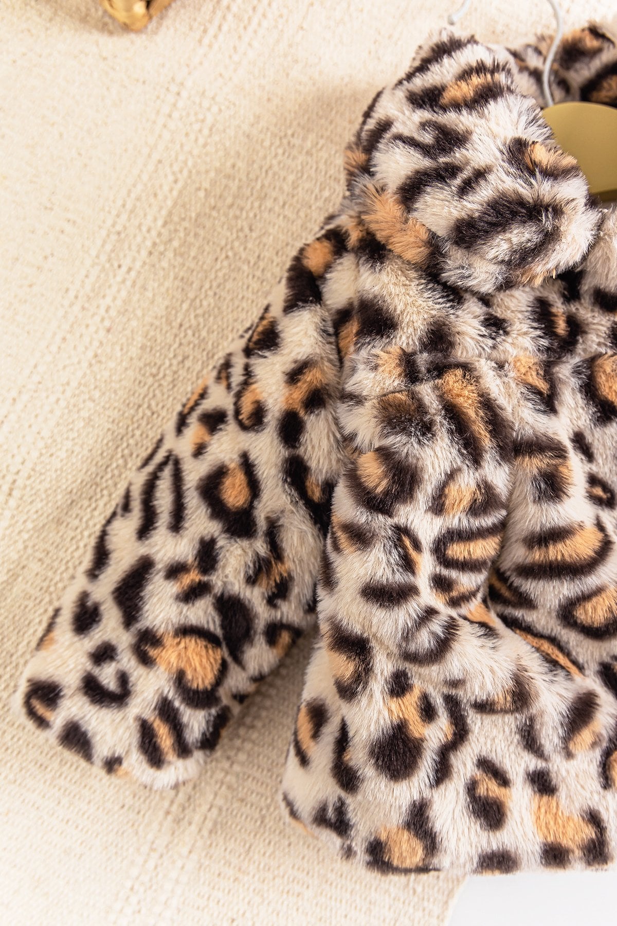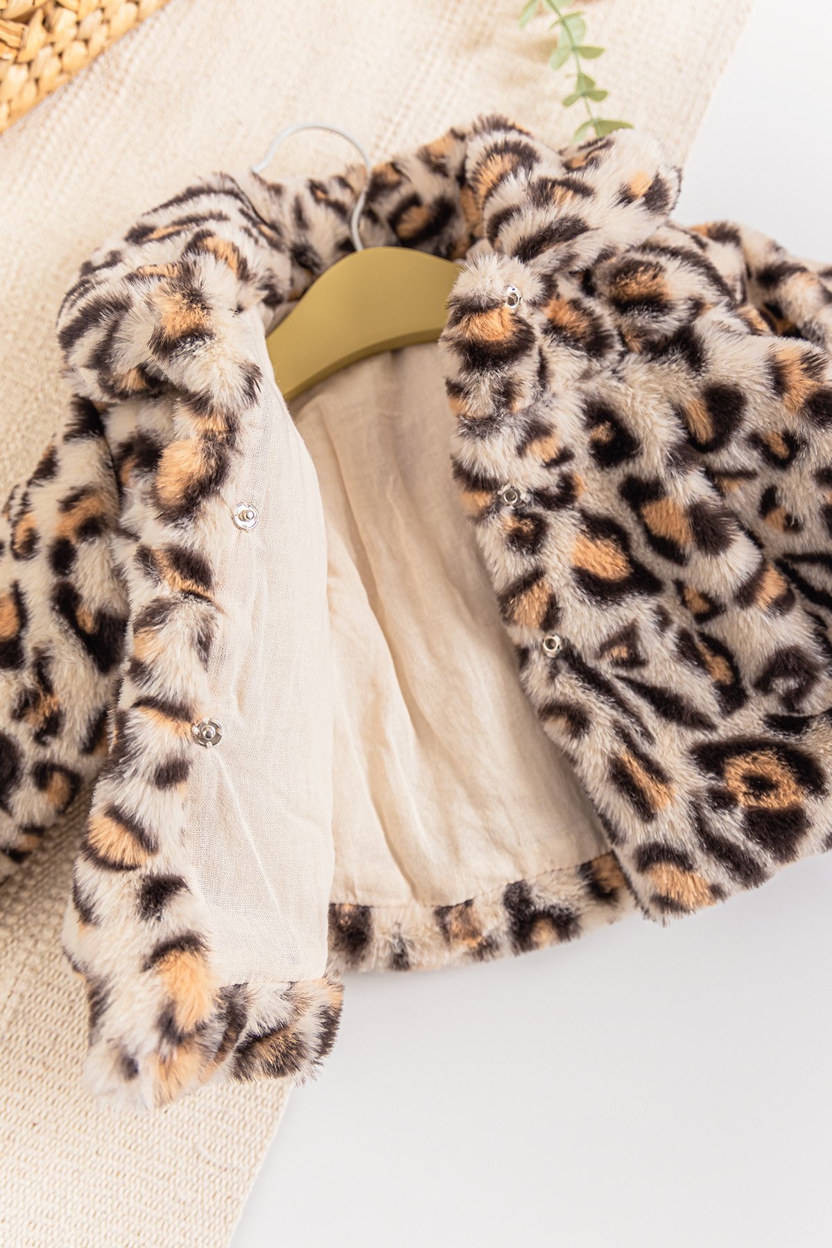 - The baby coat is leopard print and plush fabric.