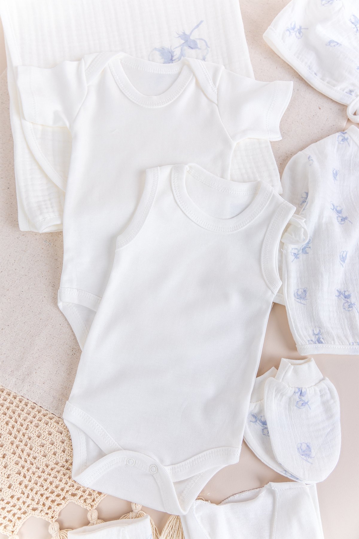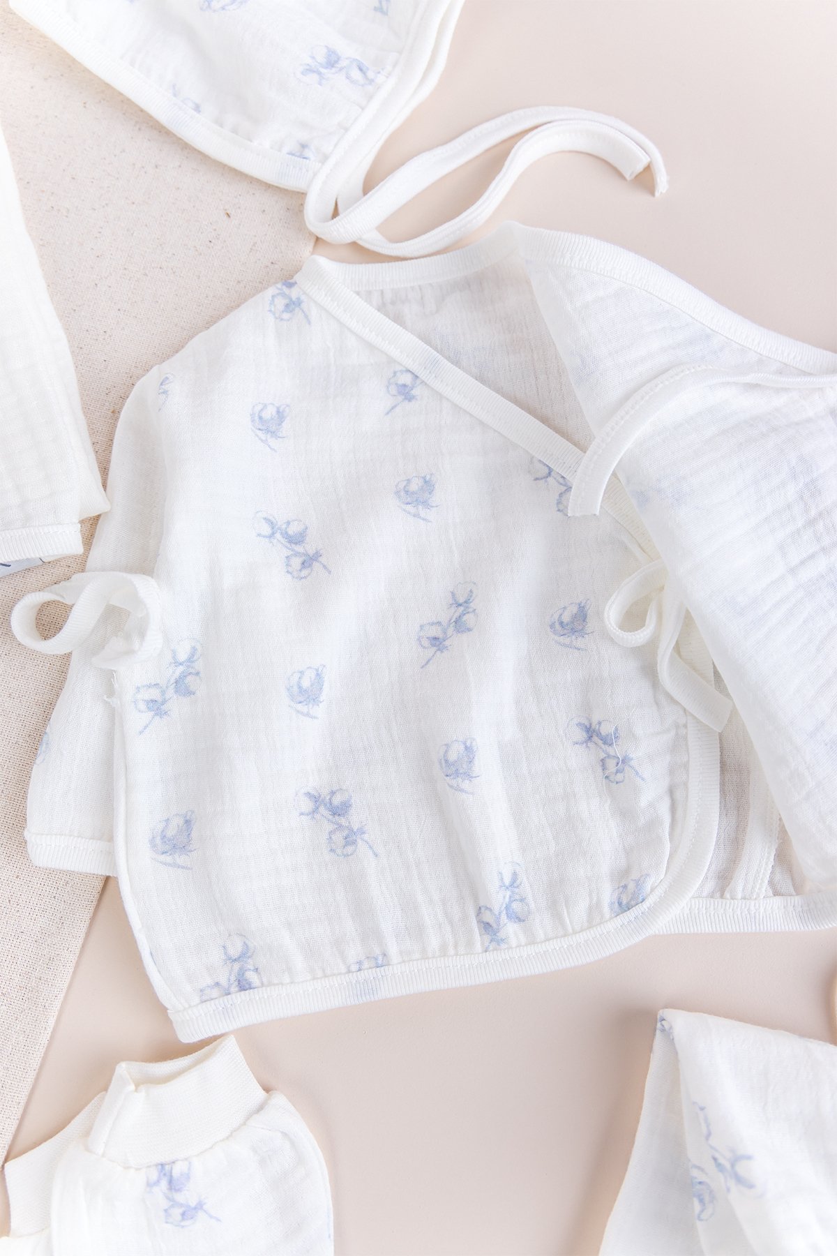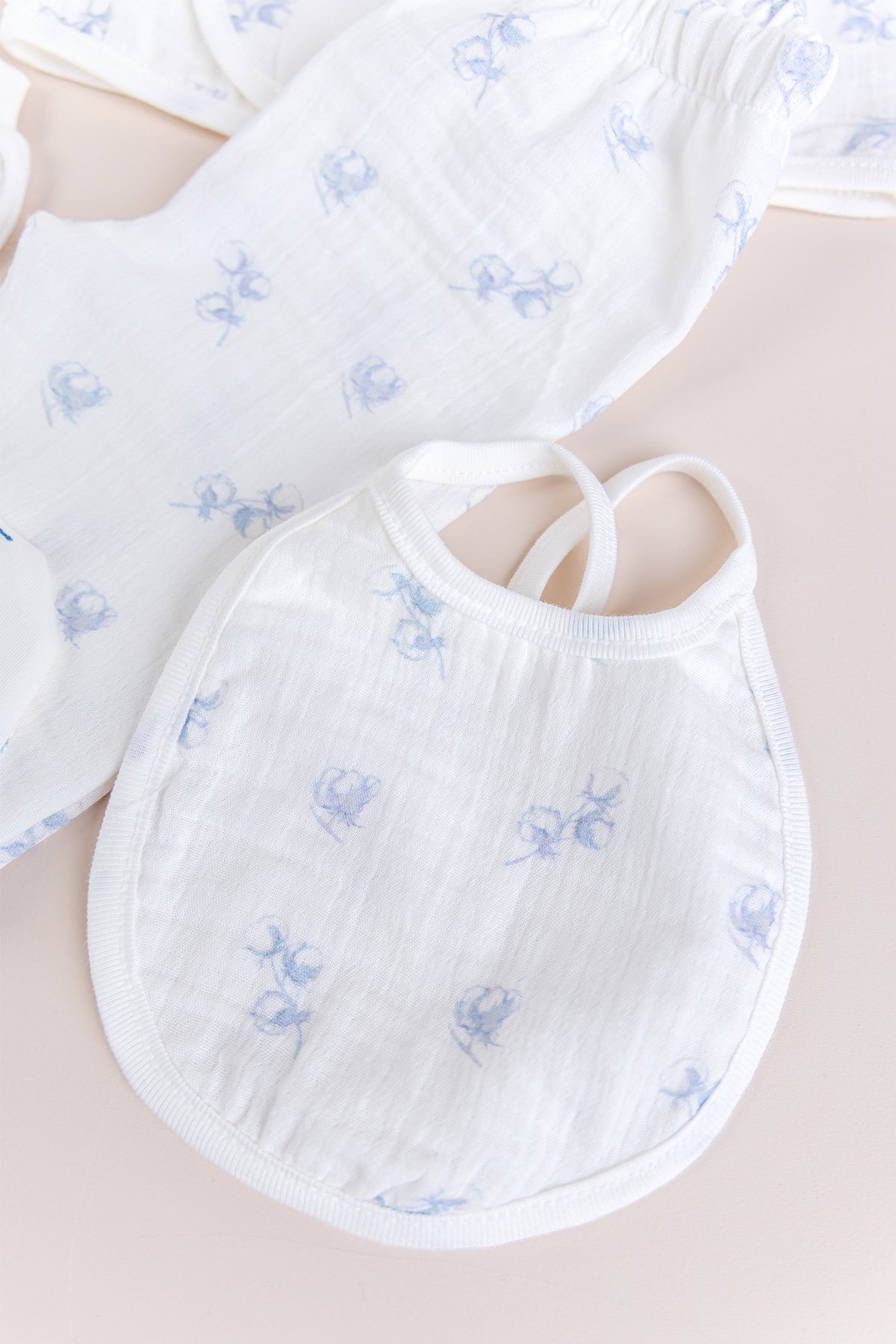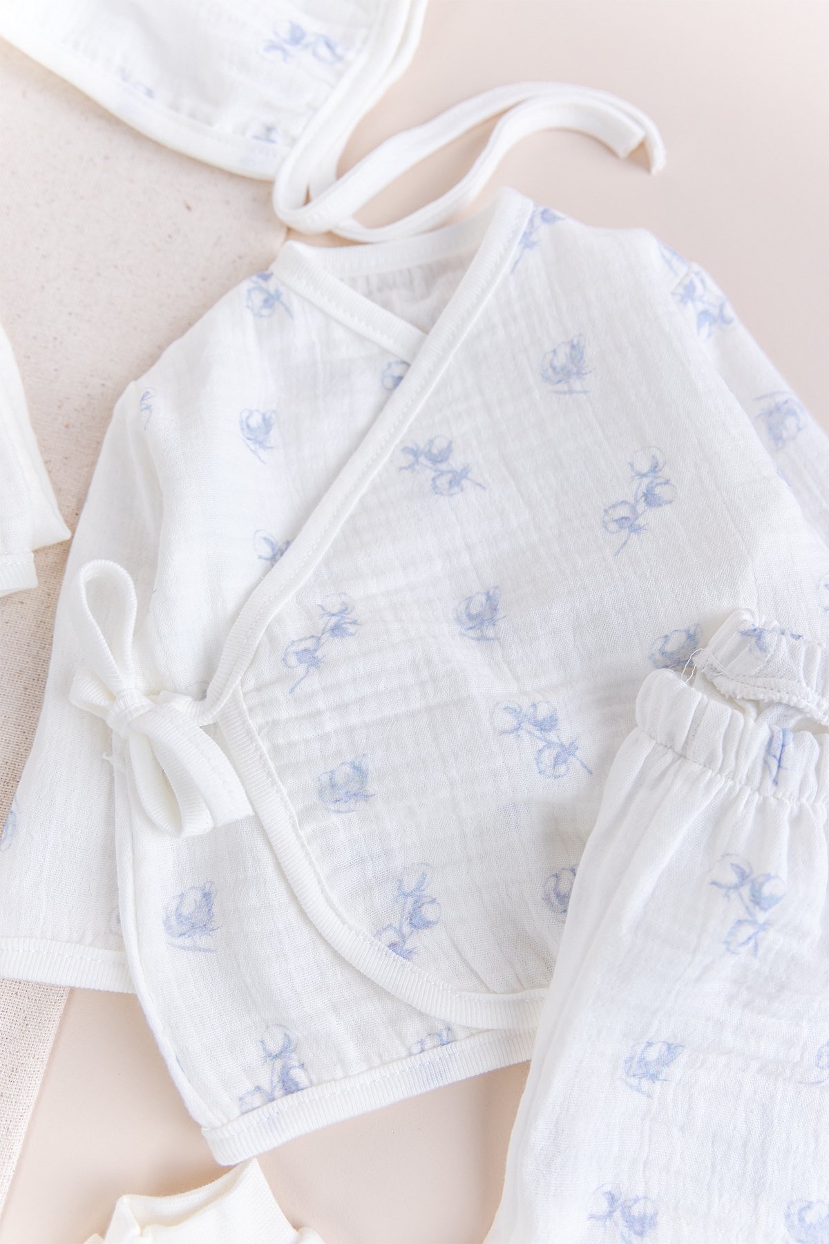 - Hassas bebek cildi düşünülerek üretilen bu set, doğal müslin kumaşının hafifliği ve konforuyla bebeğin rahat etmesini sağlar.