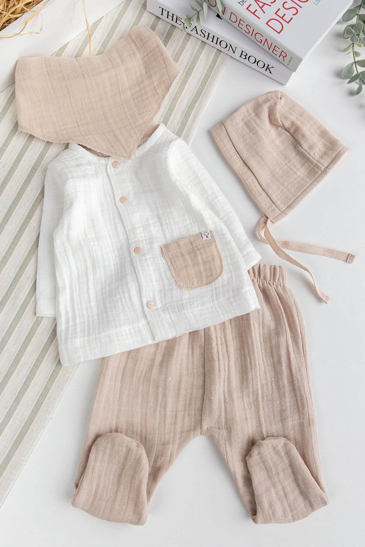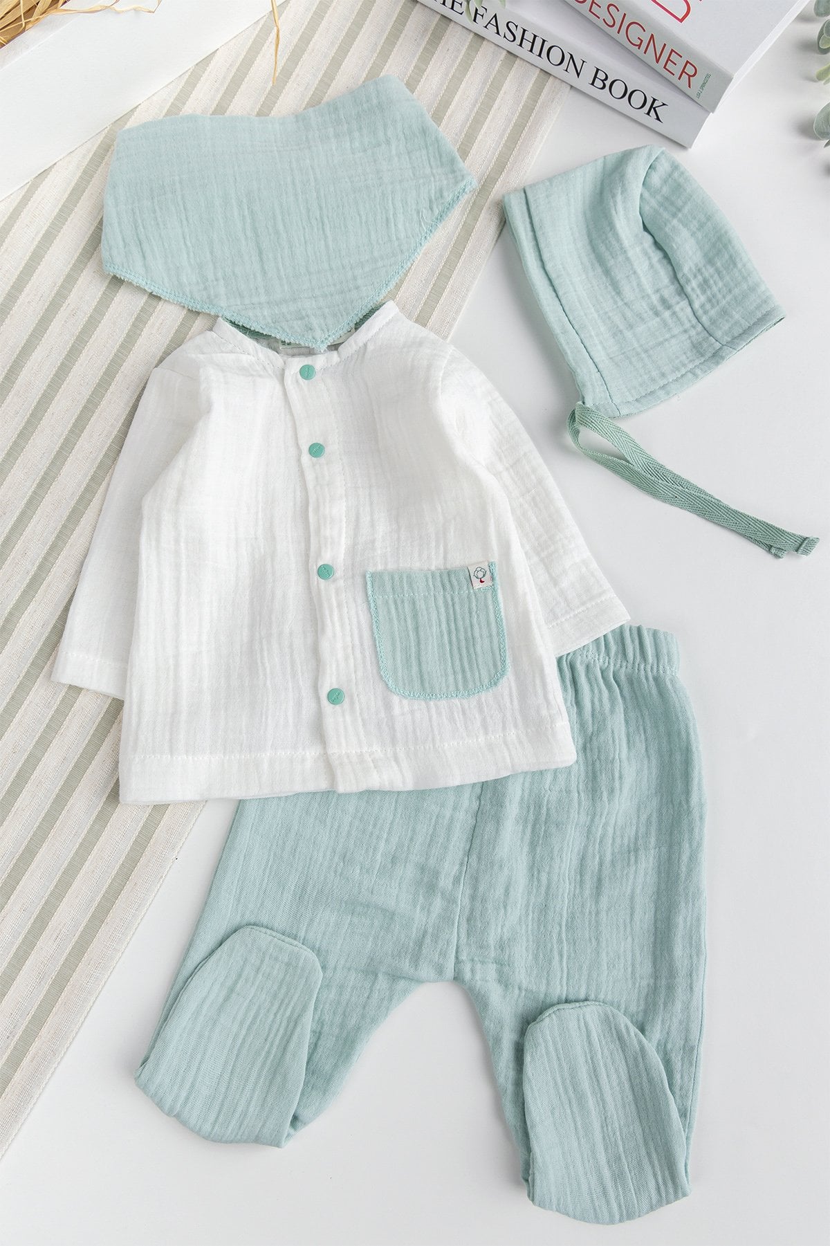 - Yeni doğan bebekler için özel olarak tasarlanmış bu 4 parçalık hastane çıkışı seti, %100 pamuk müslin kumaştan üretilmiştir.