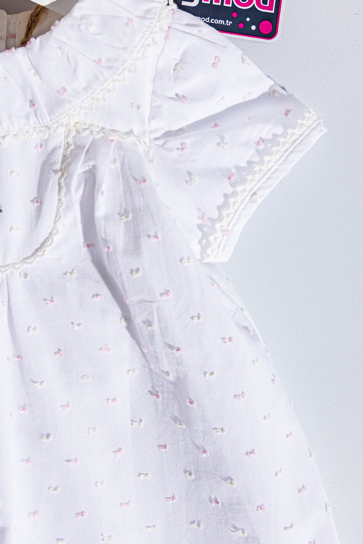 - Kısa kollu elbisenin kol kenarları dantel şeritlidir.