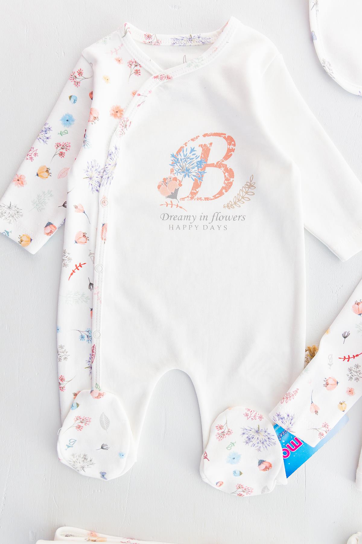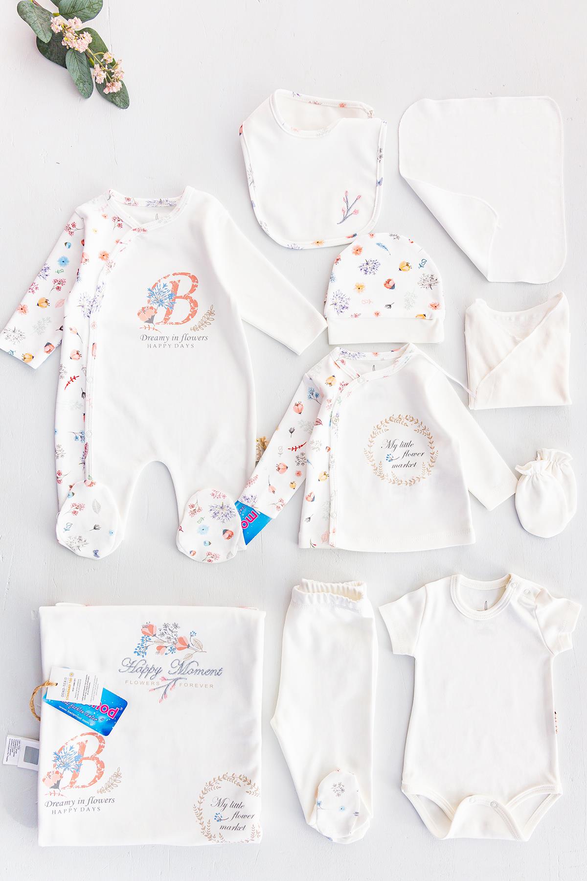 Organik Çiçek İşlemeli 10 Parça Kız Bebek Hastane Çıkışı Bebek Seti