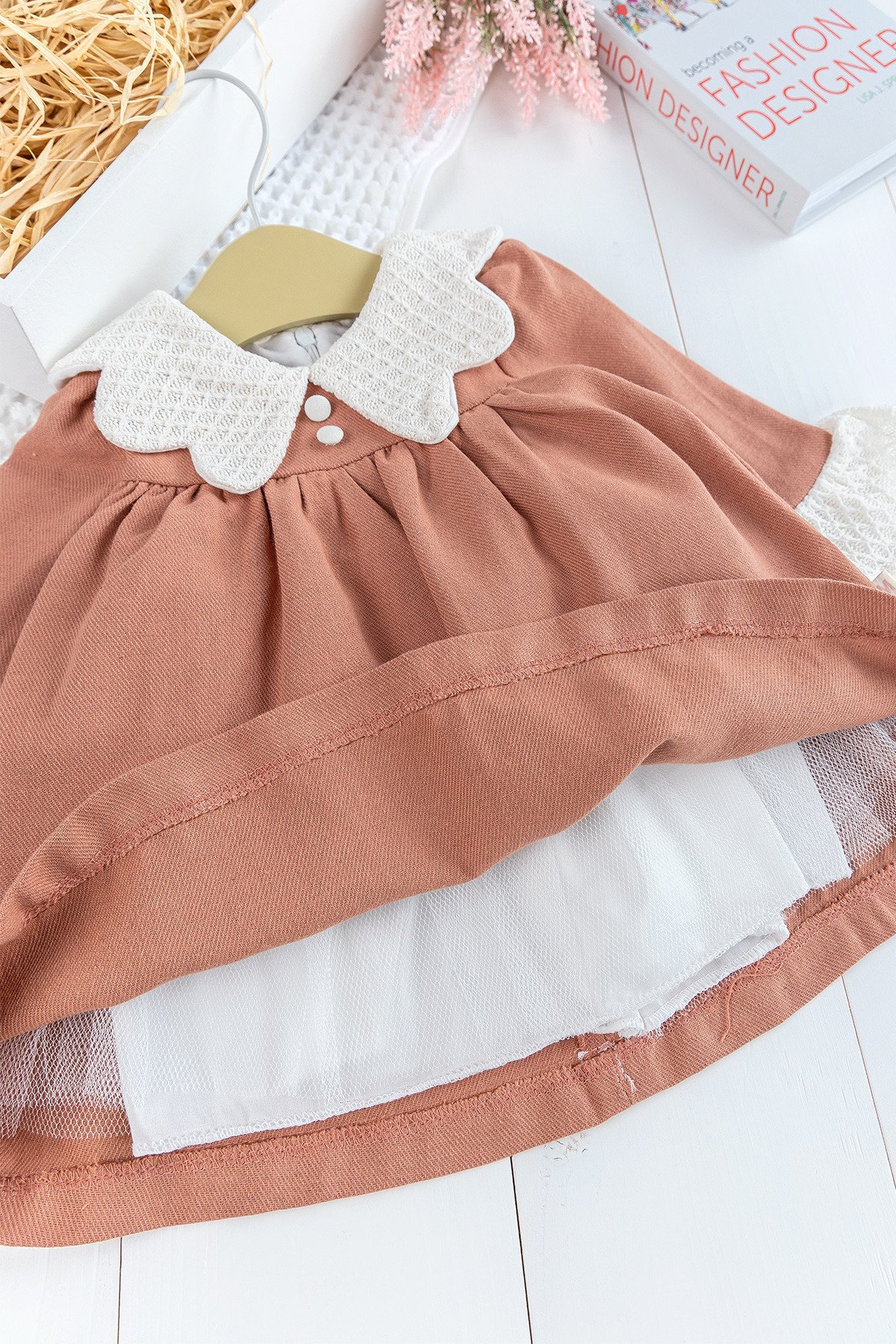 - Bebek elbisenin kol uçları volanlıdır ve örgü kumaşlıdır.