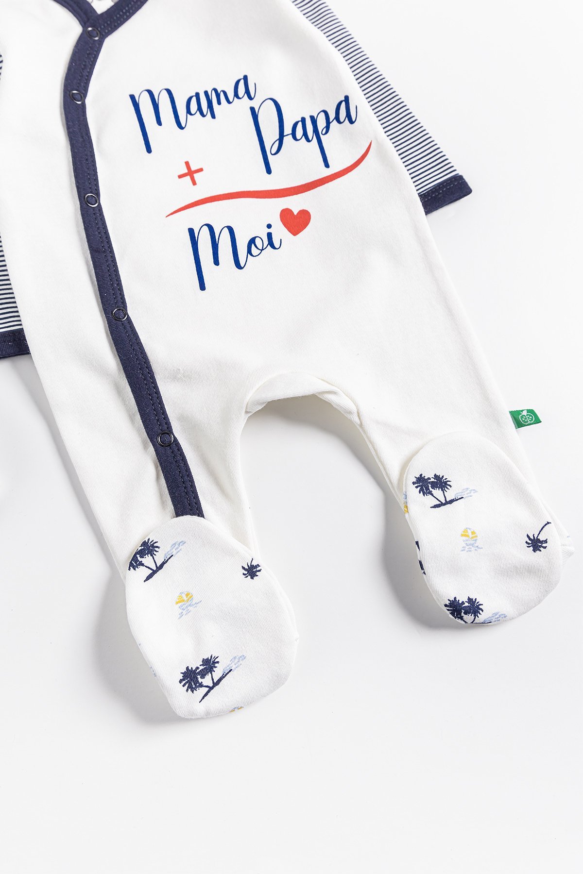 - The baby romper is palm-patterned.