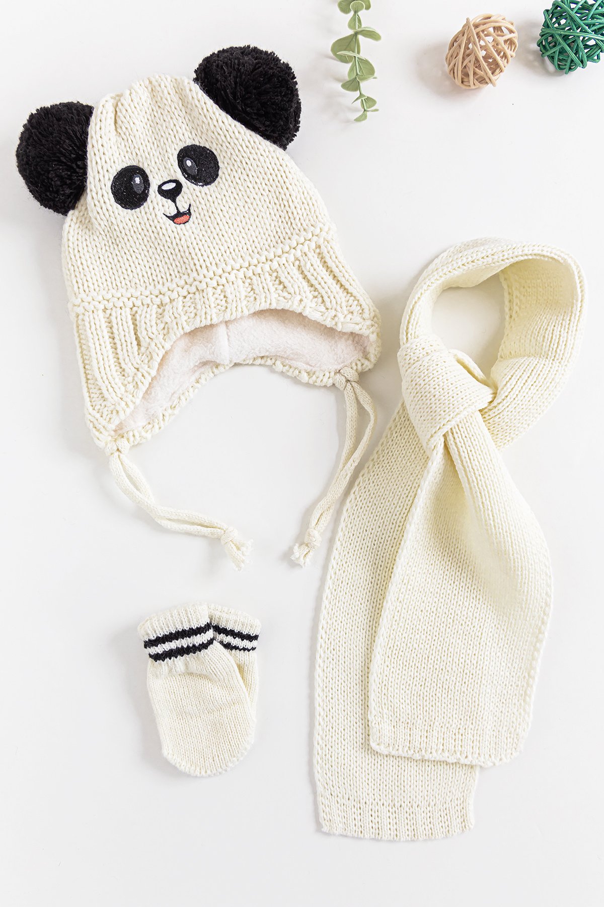 Panda Figürlü 0-18 Ay Erkek Bebek Atkı Bere Eldiven Takımı