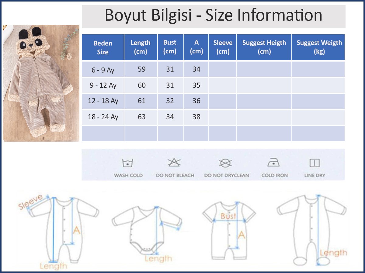 - Bebek tulumun kapüşonu kuzu welsoft kumaş ile üretilmiştir.