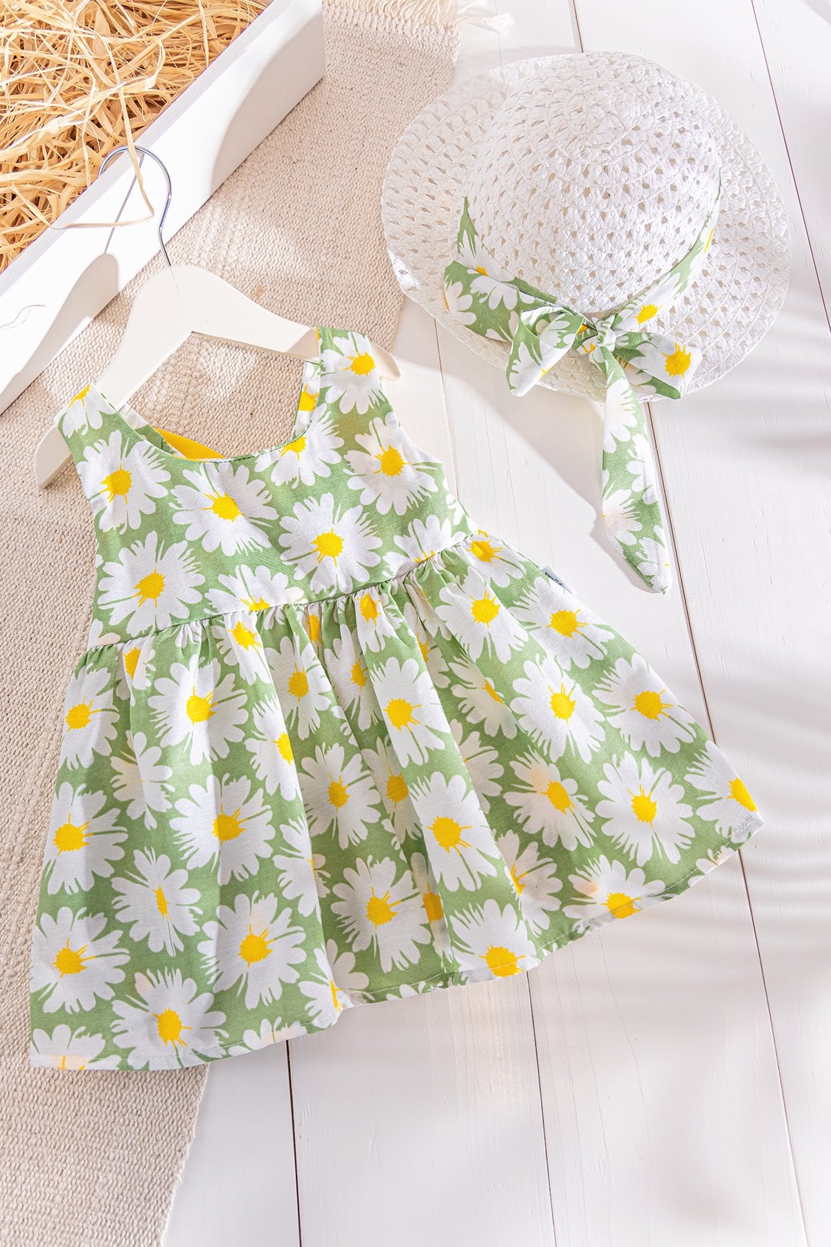 Papatya Desenli Şapkalı Kız Bebek Yazlık Elbise