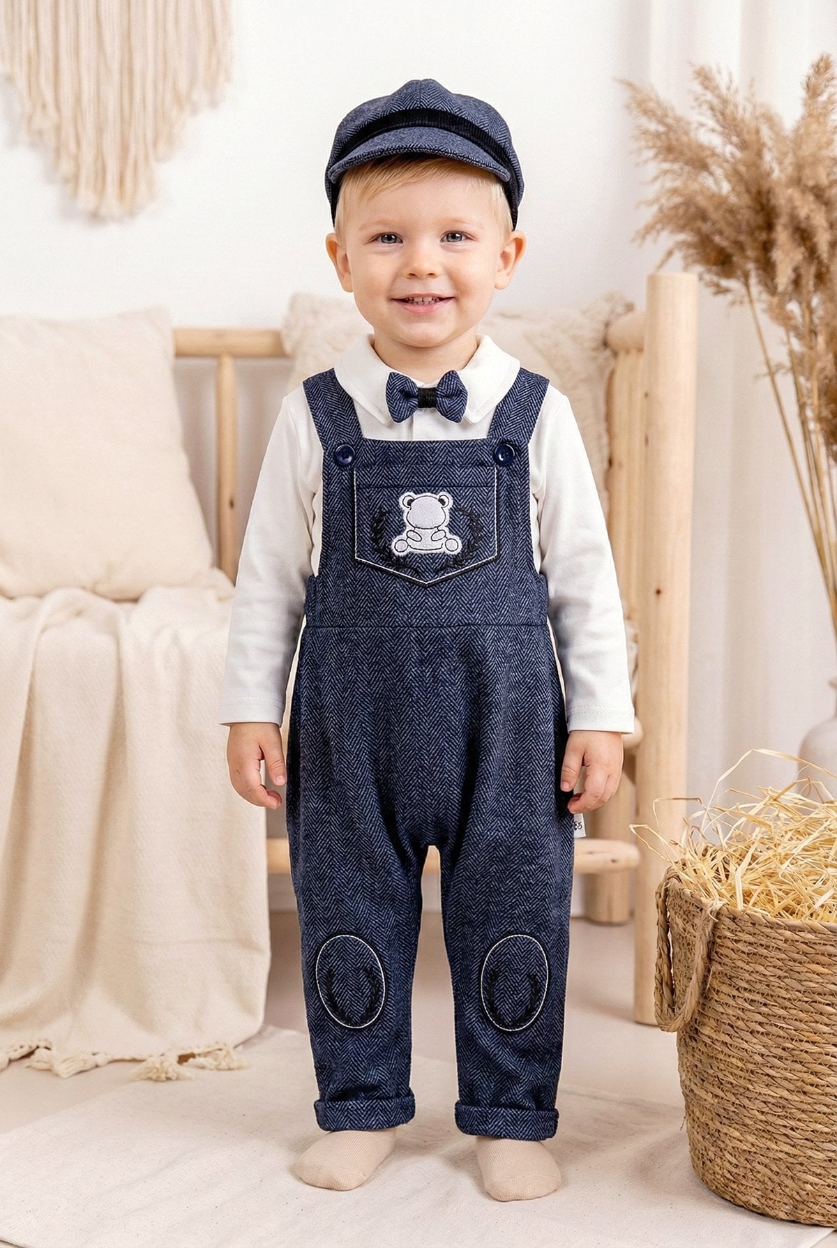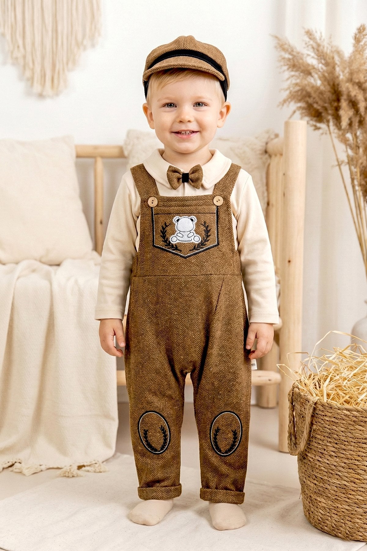 Papyonlu Kasketli Erkek Bebek Salopet Tulum Set