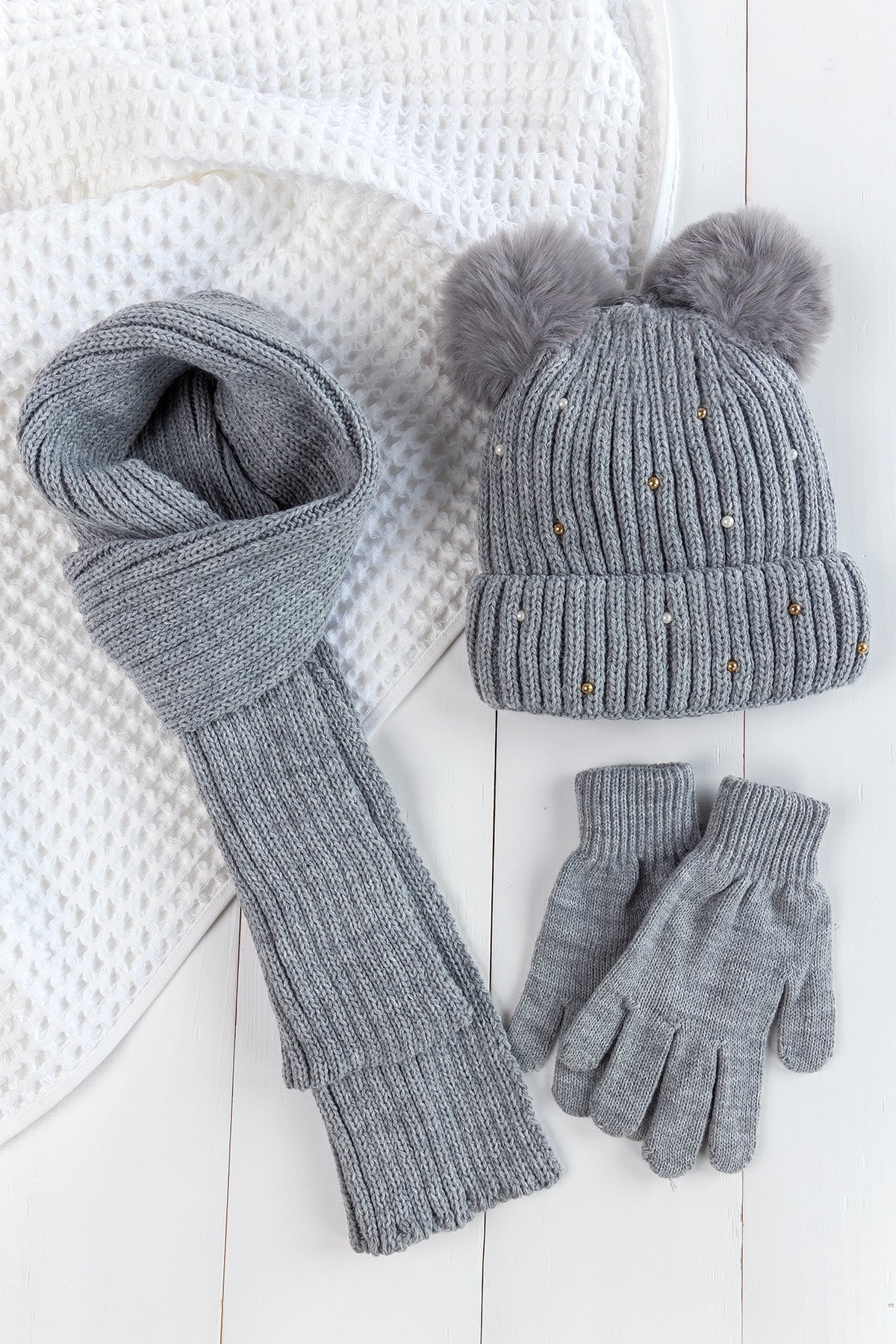 Babymod 9-15 Years Old Girl's Scarf, Beret and Gloves Set with Pompom and Pearls