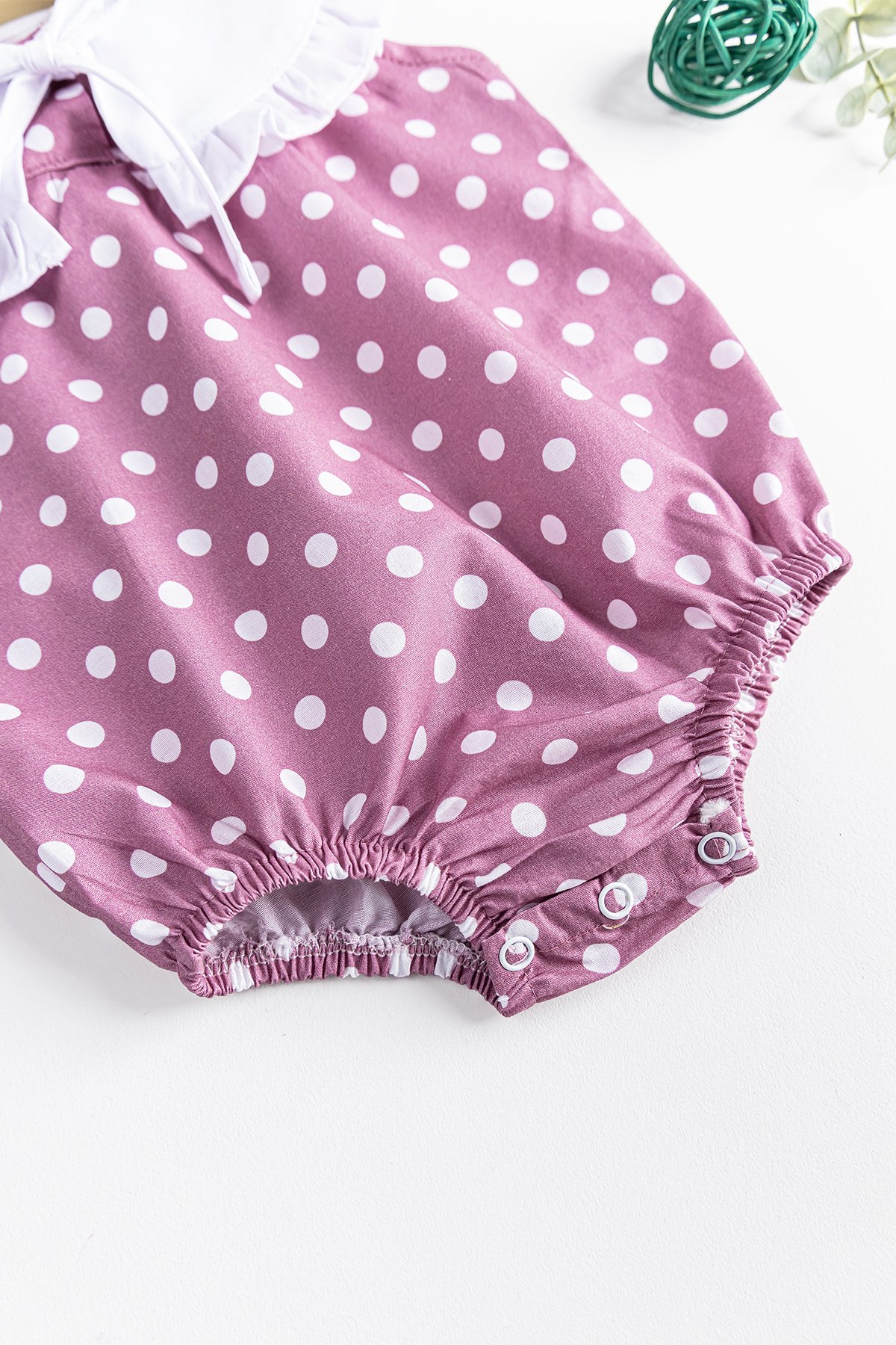 - The collar of the baby romper has a frilled collar with fastening detail.