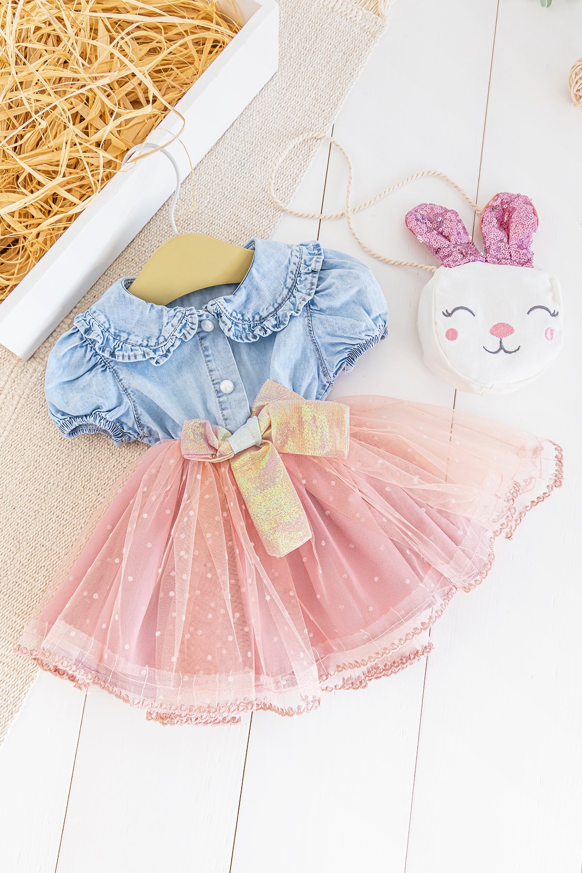 - Bebek elbisenin bel kısmında simli fiyonk detayı mevcuttur.
