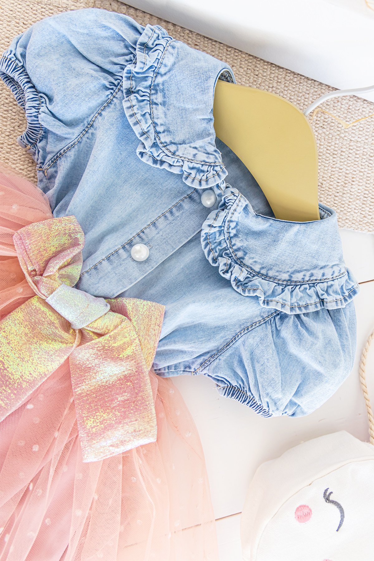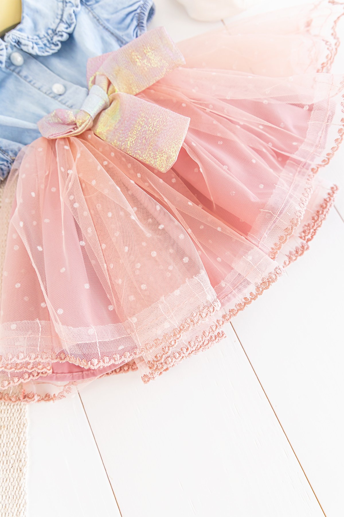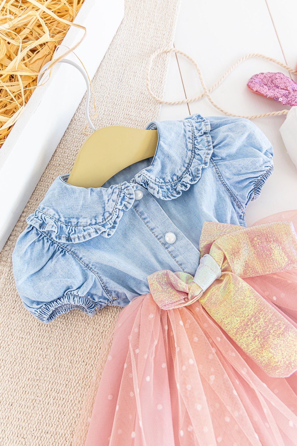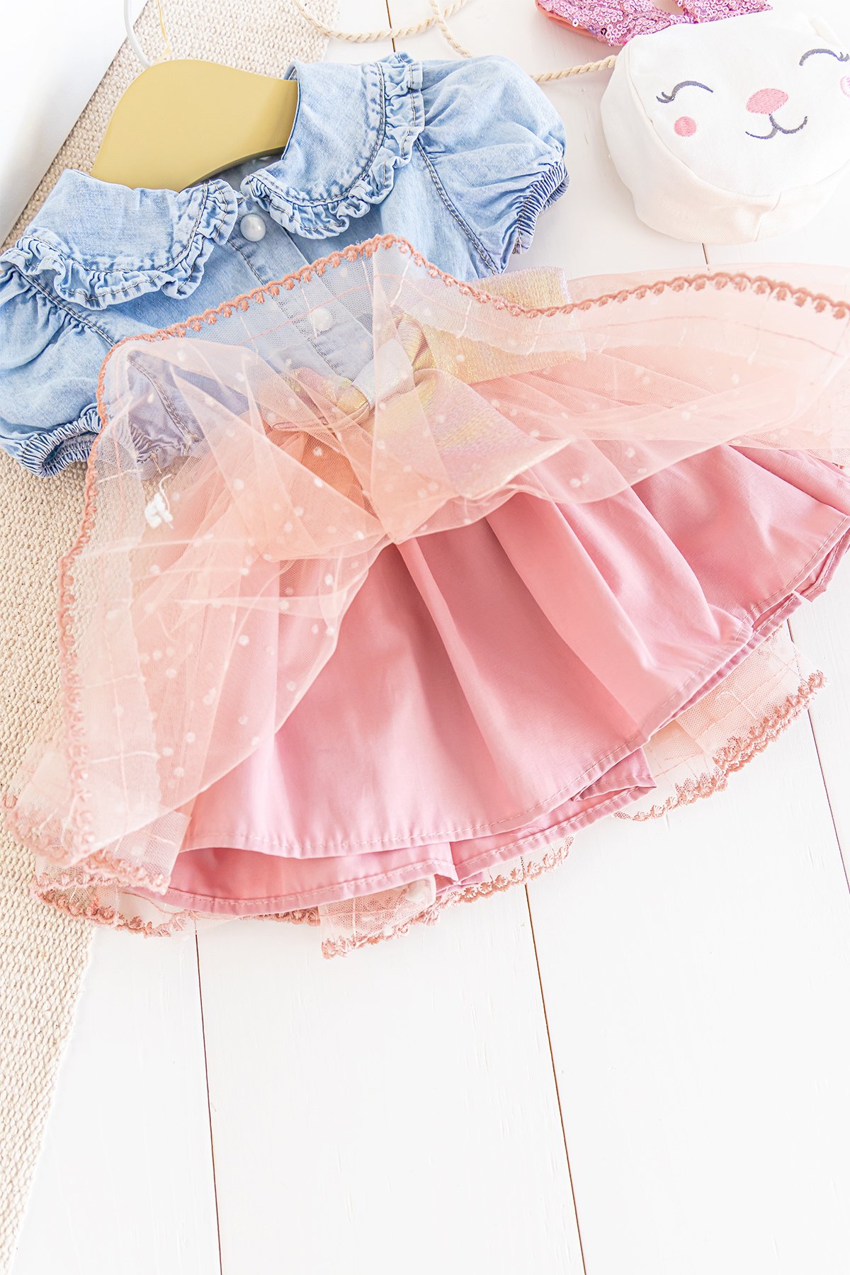 - The upper part of the dress is made of denim fabric and the skirt part is made of tulle.