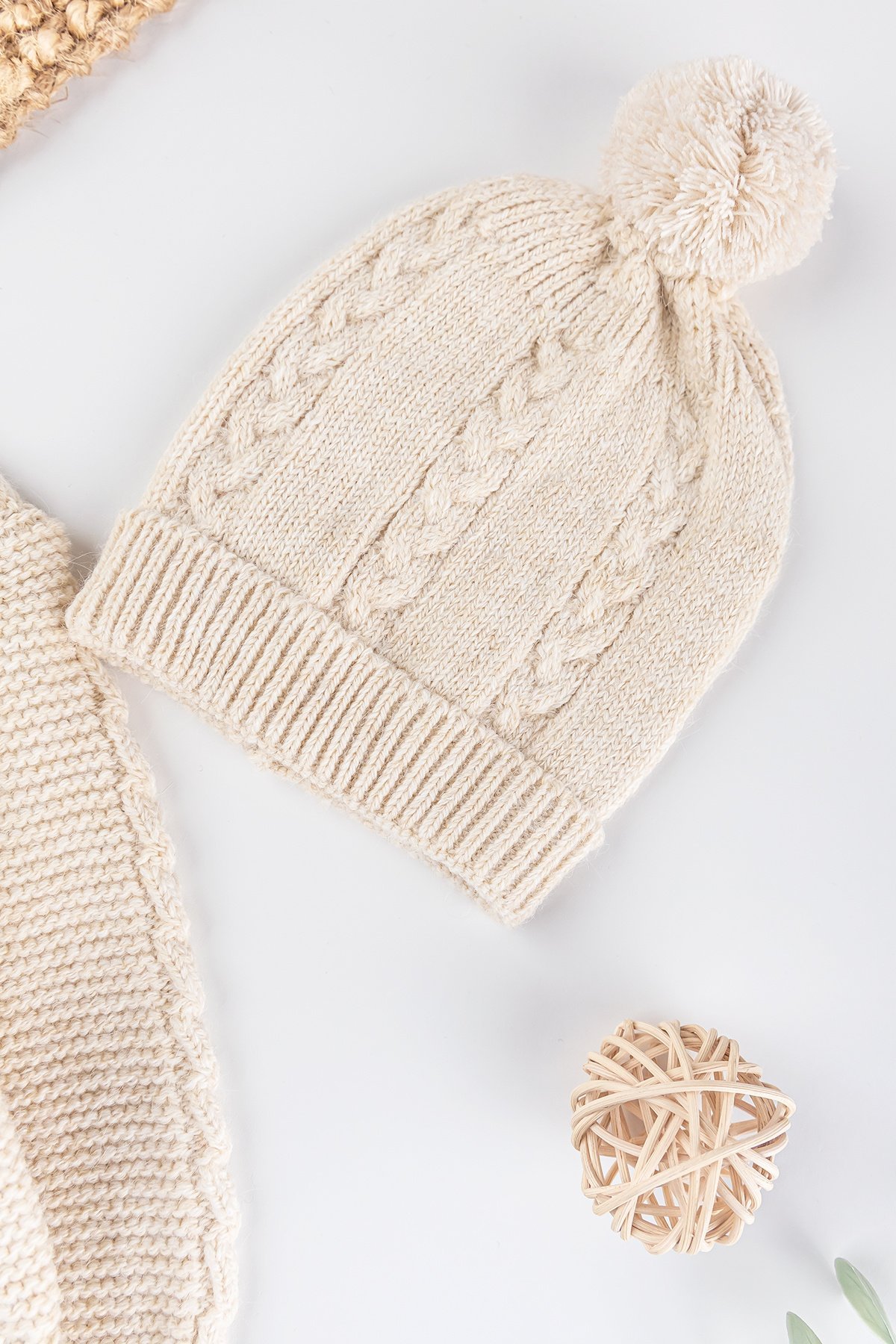 - The baby beanie has pompoms.