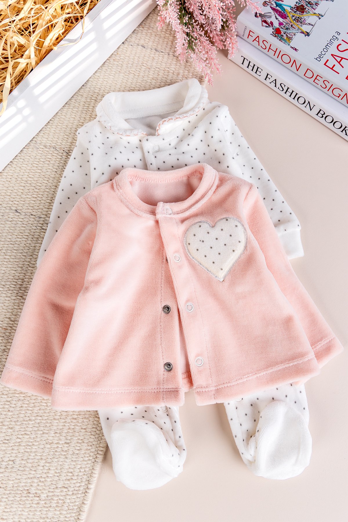 Hırkalı Bebe Yaka 2'li Kadife Kışlık Kız Bebek Tulum Set