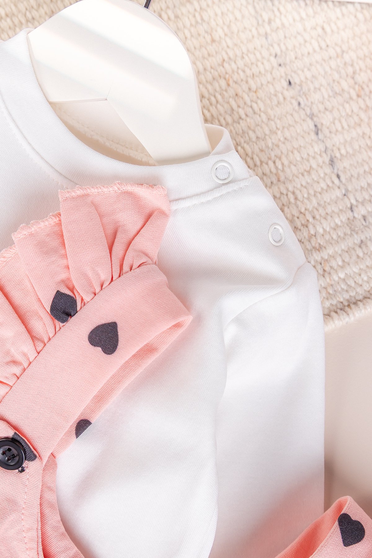 - Sevimli kalp deseniyle süslenmiş tasarımı bebeğinizin şıklıgını ve neşesini yansıtır