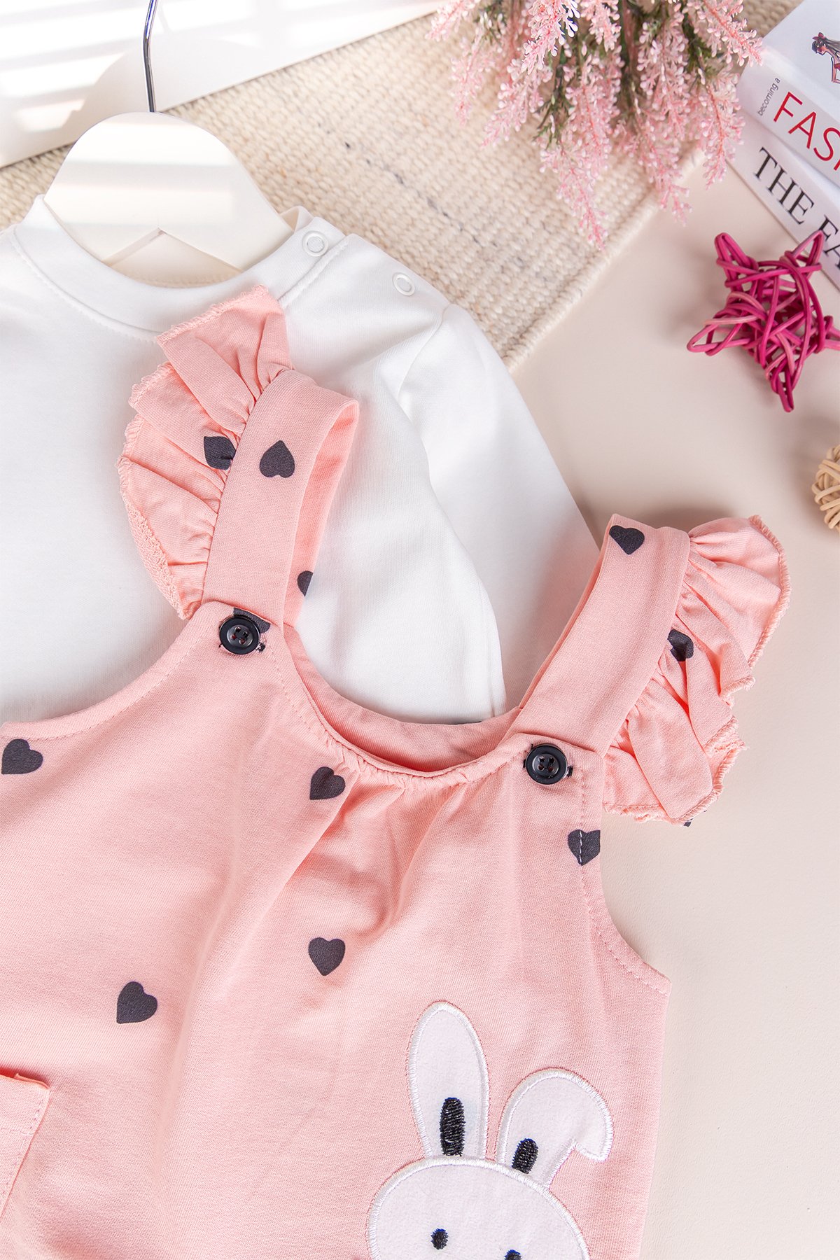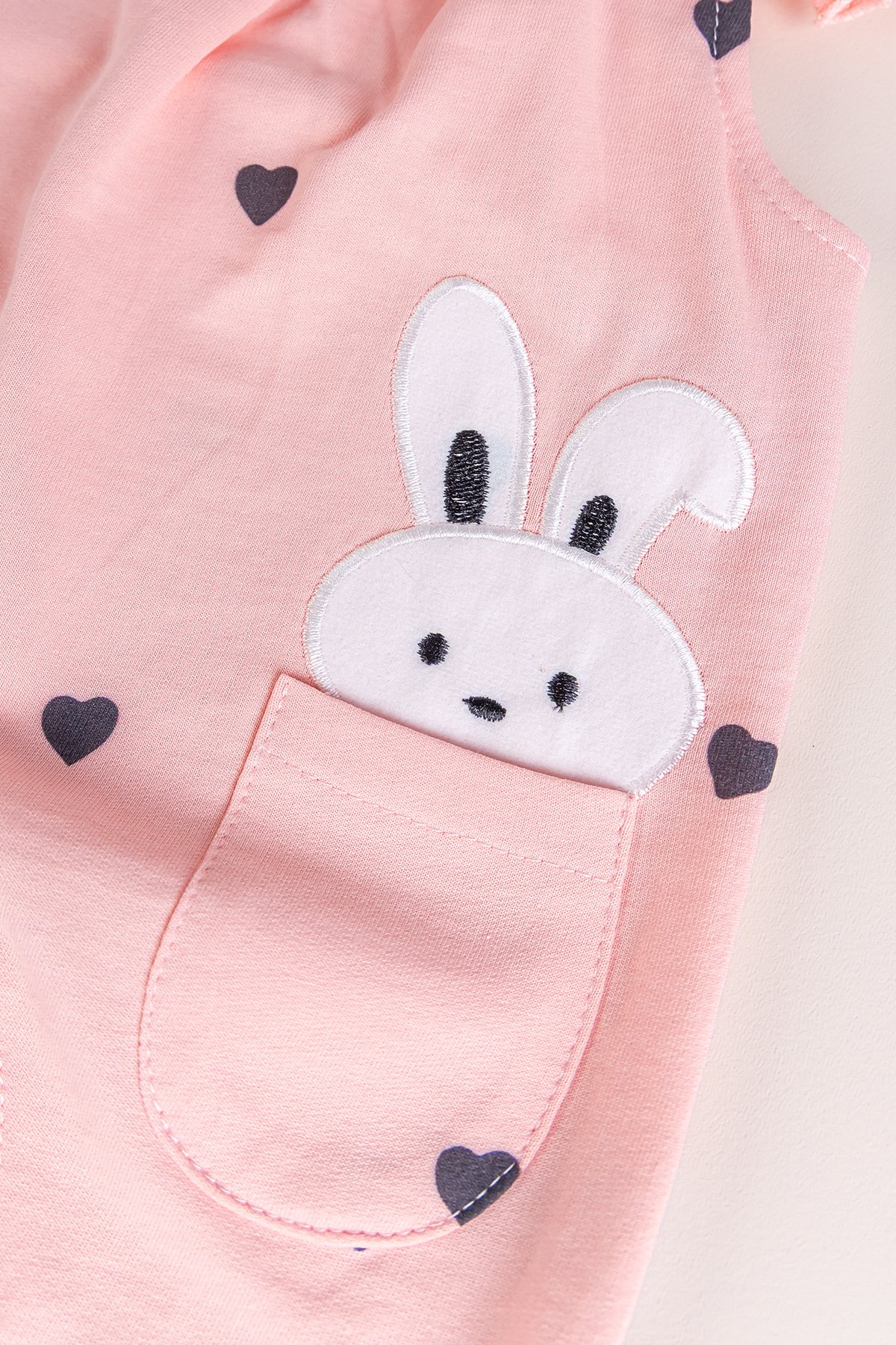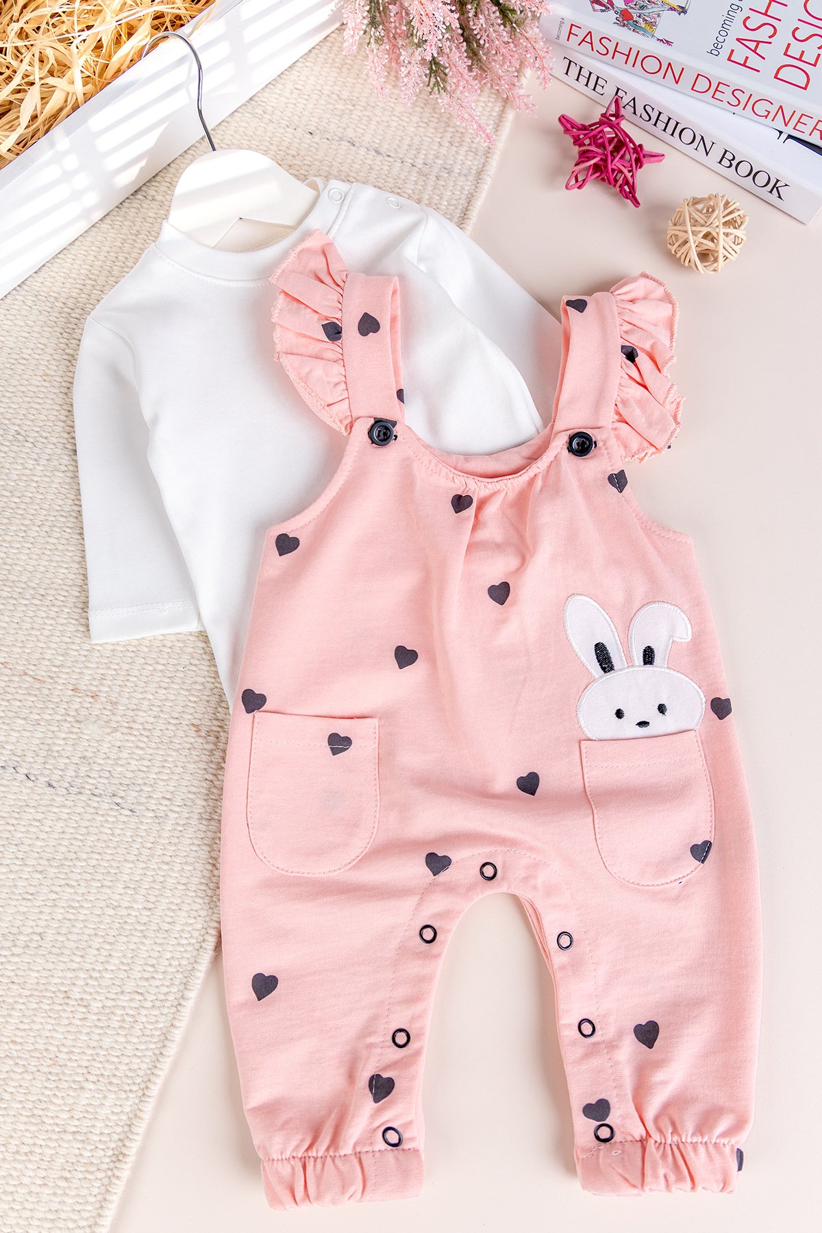 - The baby overalls are heart printed rabbit embroidered.