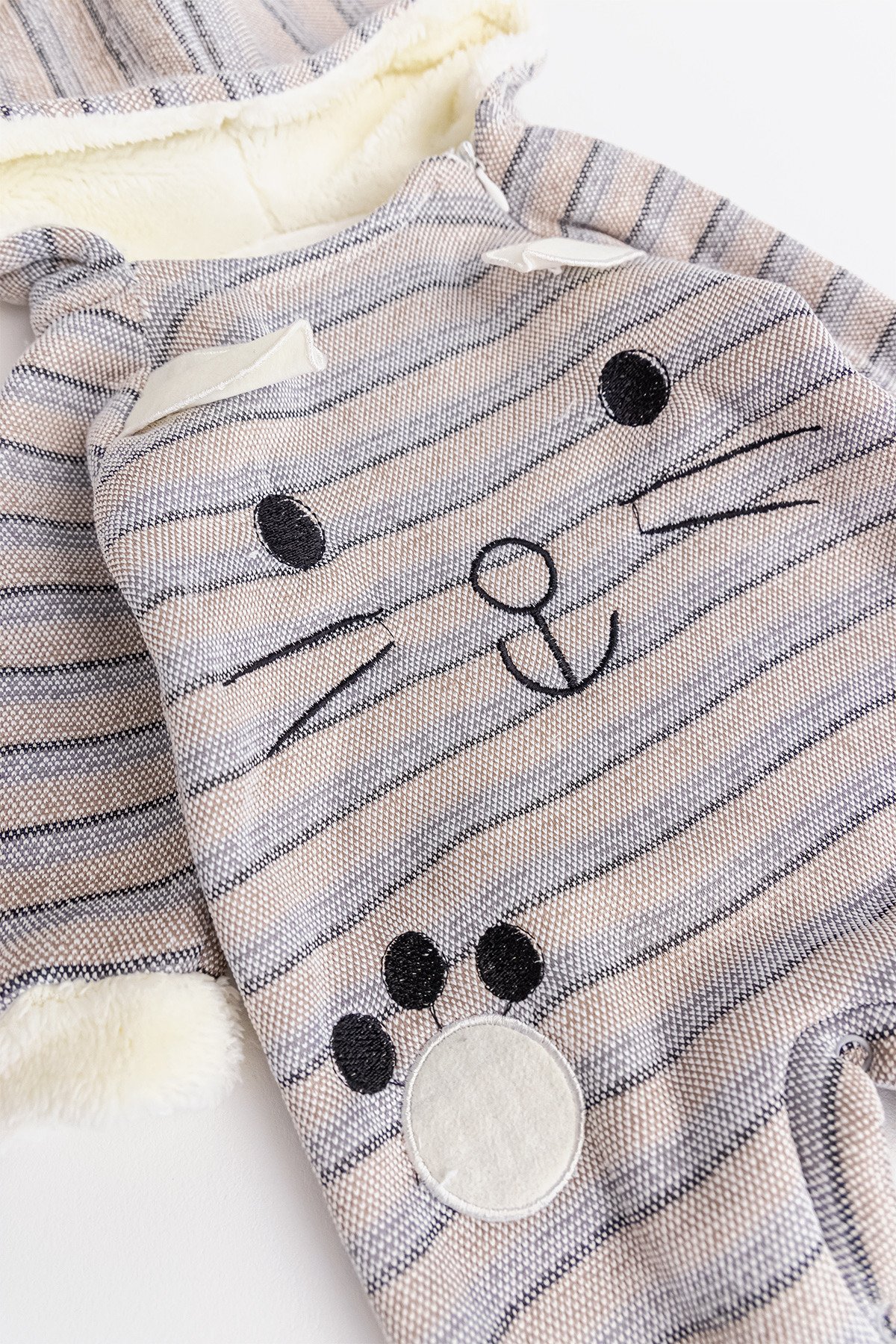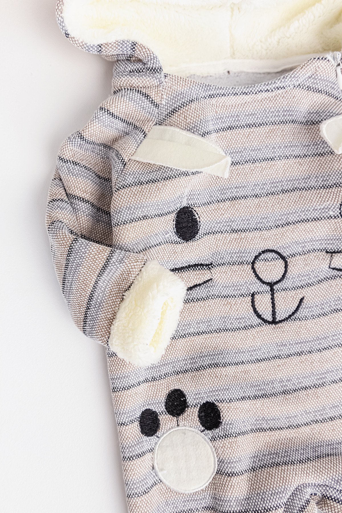 - The hood of the jumpsuit is lined with plush.
