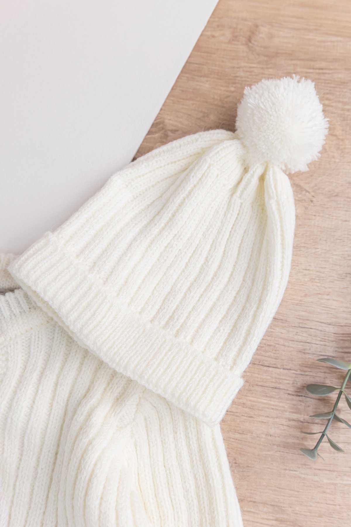- The baby hat has pompom detail.