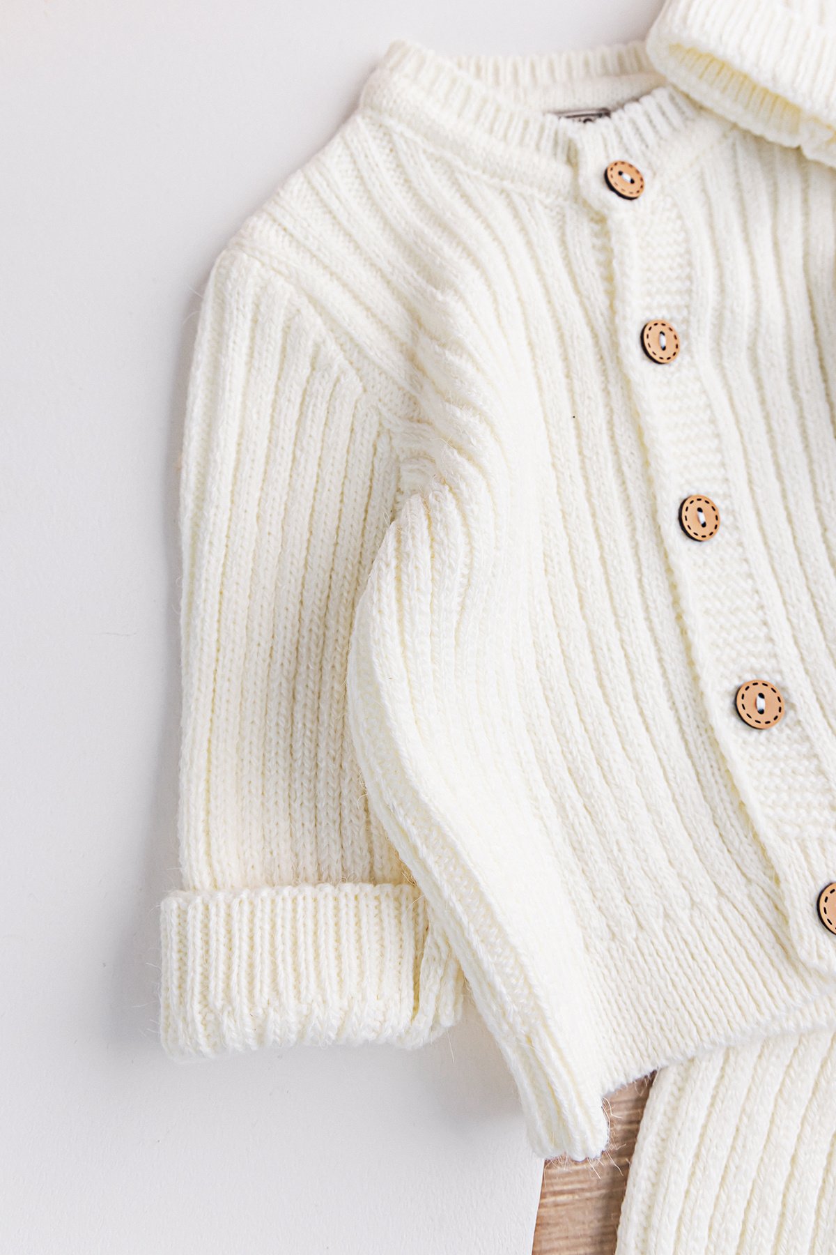 - The sleeves of the baby cardigan have folding details.